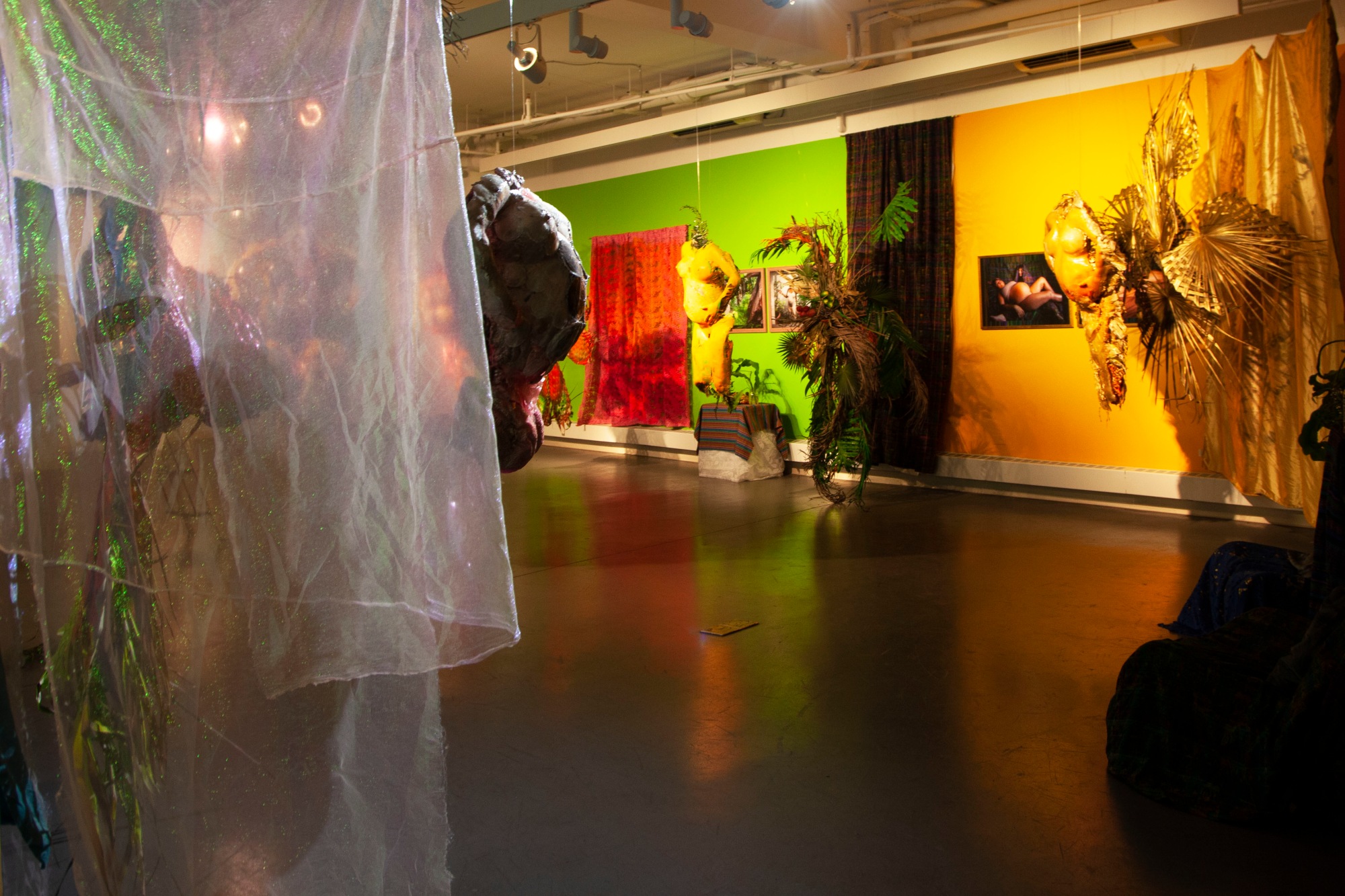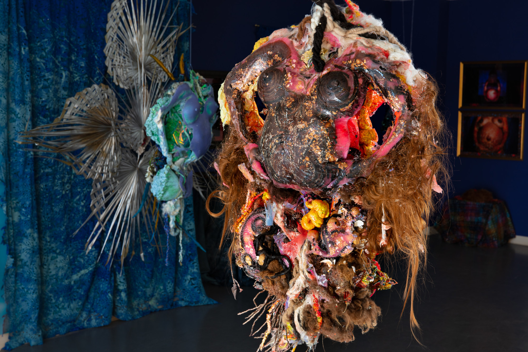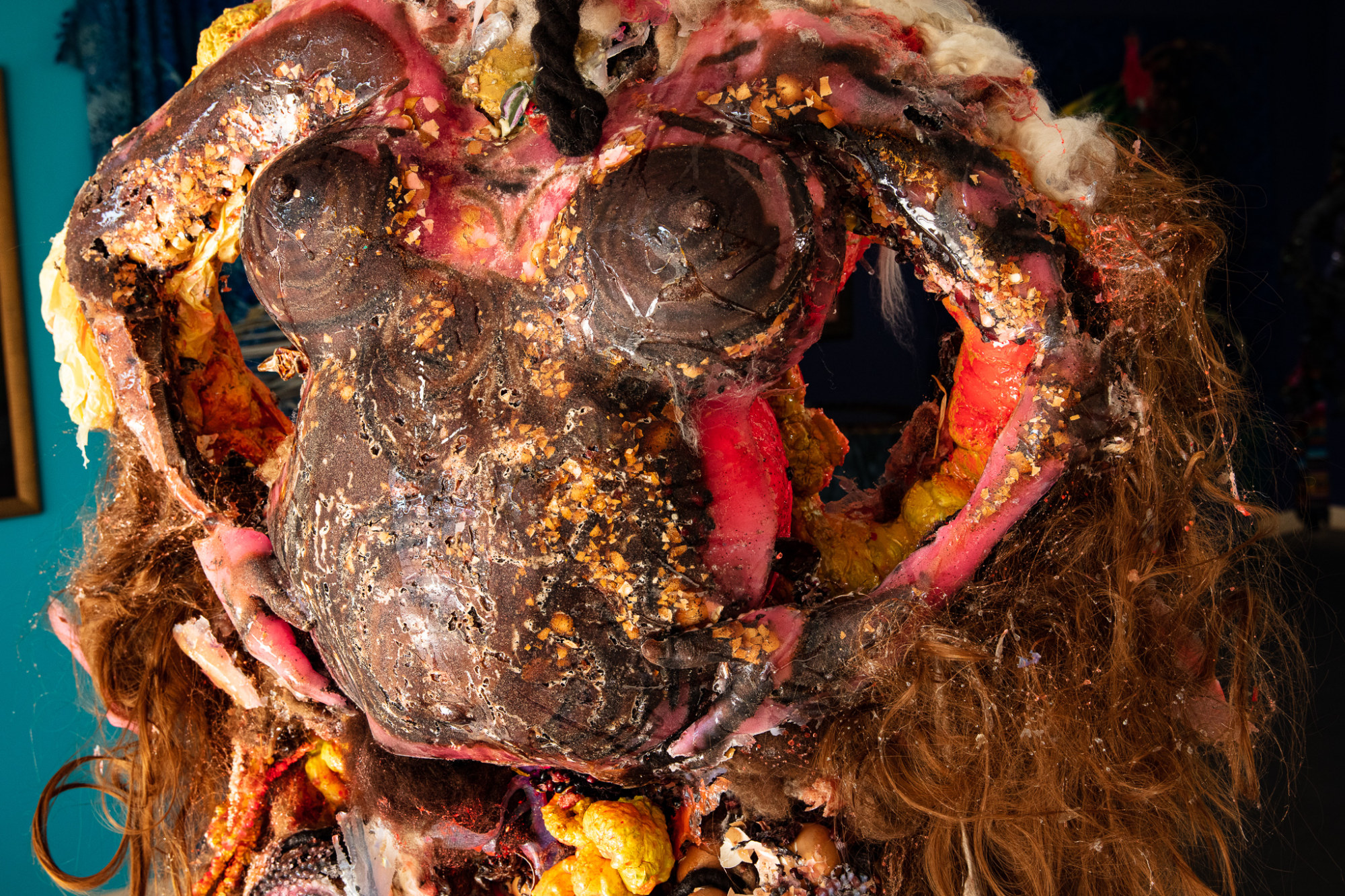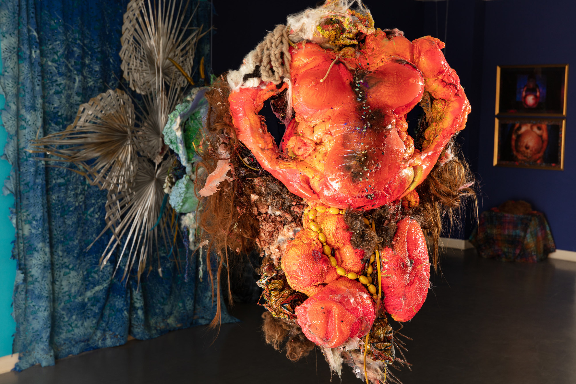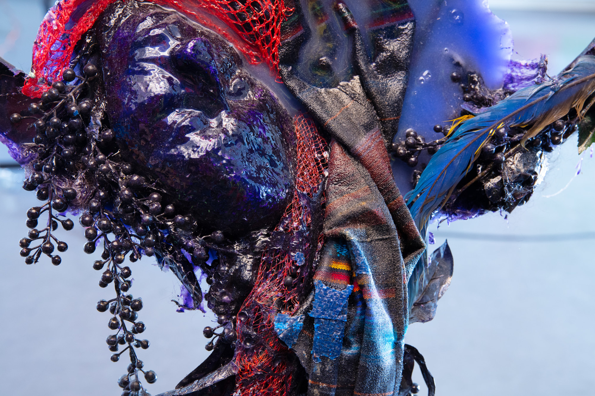 Together, the sculptures and photographs represent Rodriguez Meyer’s cultural translation of the legacy of institutionalized and biological violence in the artist’s biographical community. Built with a maternal healing recipe and identity construction materials, the Mother Mold sculptures formalize the intersections between the maternal health crisis and climate change. The cumulative impact of land seizures and development projects, as well as the accelerated extraction of natural resources in the last five hundred years has forced millions in the Global South to abandon millinery traditions for military medicine. In response, Rodriguez Meyer builds monuments to mixed motherhood that present intimate ephemera and environmental waste as powerful monuments of survival. The sculptures are bound by biological and biographical family remains; bathed in resin, painted with fruit, housed in palm or corn husks, insulated by hair, tucked in sea debris, and braided with palm fronds.