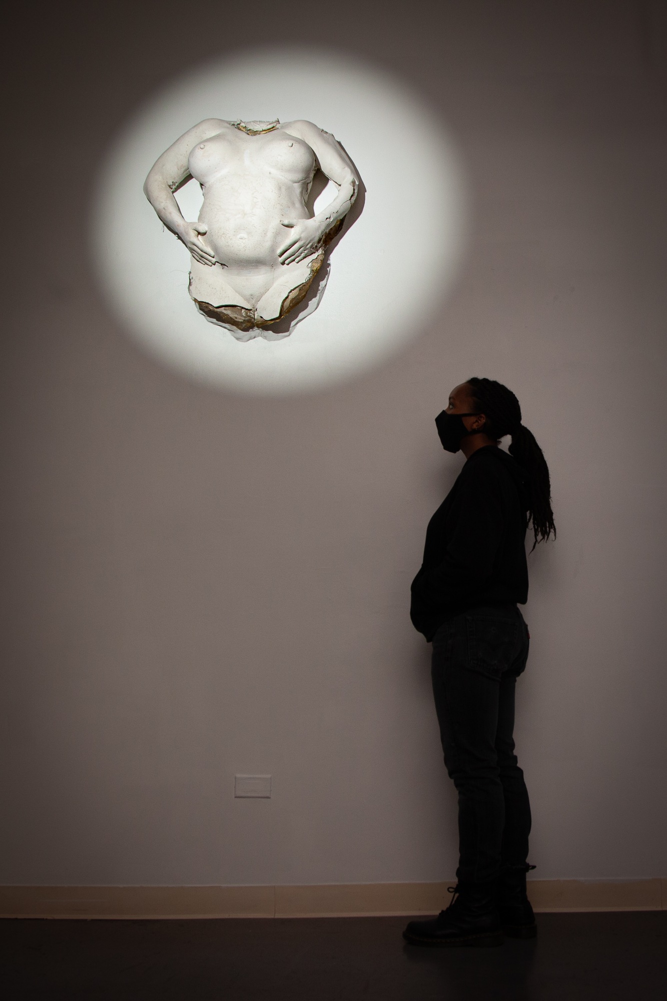 Mother Mold sculptures are maternal monuments created by, of, and for pregnant people. The artist casts her Black and Brown birthing community within their own life force to create sculptures that resonate with the complex beauty and terror of creating life and giving birth in America. Drawing on sculptural technologies developed in Indigenous and revolutionary societies, Rodriguez Meyer’s references range from mummification in ancient Egyptian, pre-Columbian Andean, and Incan civilizations to Death Masks in the French Revolution.