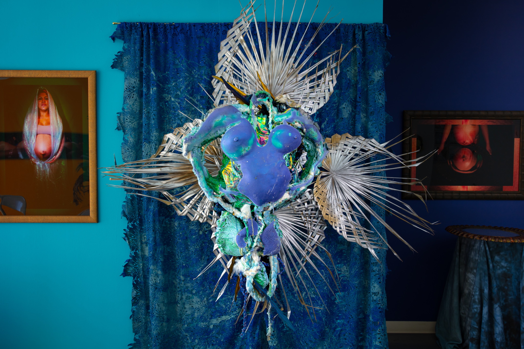 Materials: Guatemalan serape fabric, alpaca & llama quipus, braided bamboo fiber, cotton balls, nylon rope, iridescent film, Cuban “colonia” perfume bottle, turquoise powder, salt, coconut powder, white quinoa, floor resin,wall insulation foam,interior latex house paint, tropical flowers, plastic funerary plants