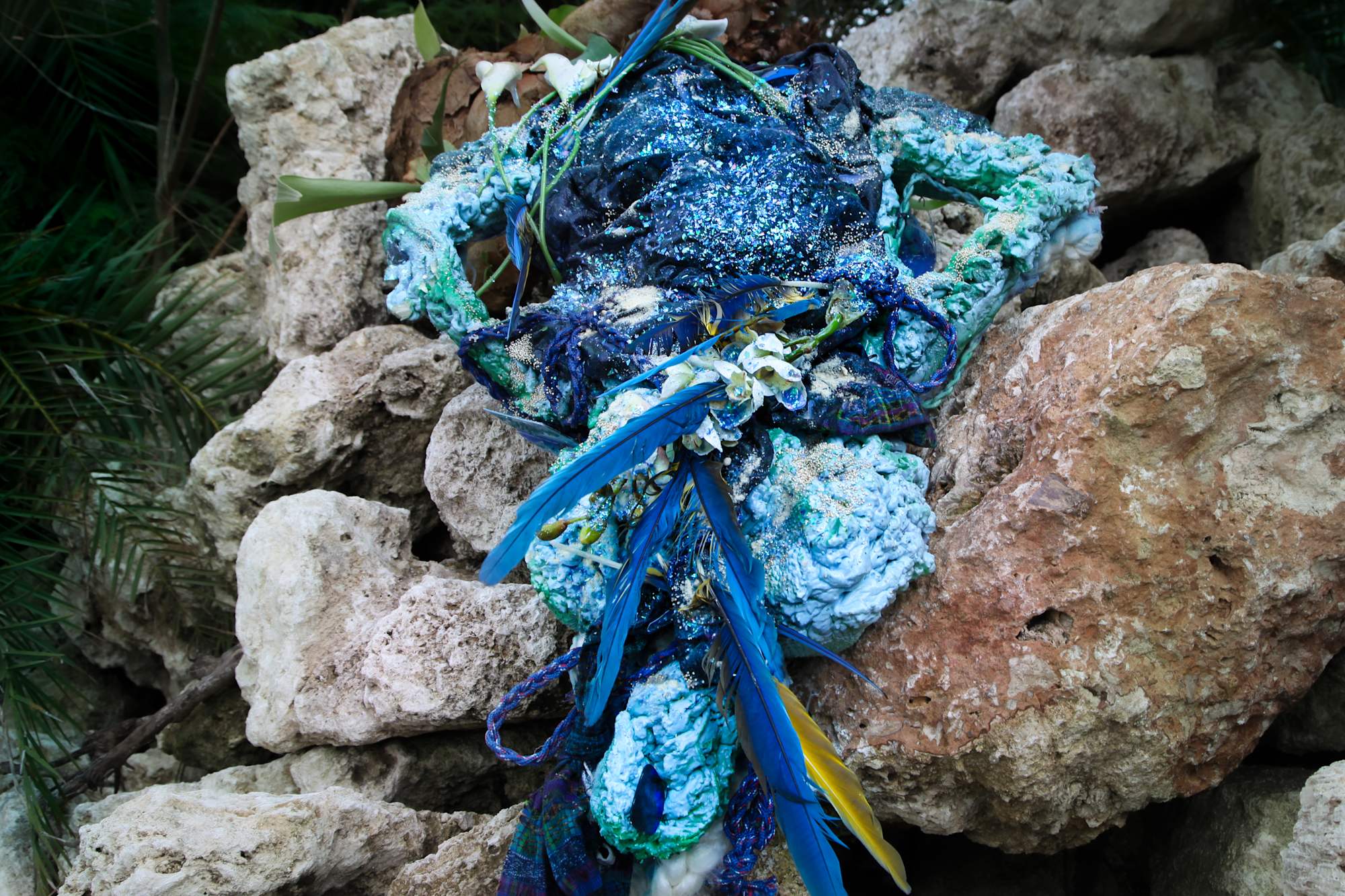 A turquoise and cerulean pregnant figure appears washed up amidst excavated coralina stone composing the bedrock of the Caribbean. A syncretic pieta between an exotic, synthetic mother and her endemic habitat, the maternal materiality of nature conditions the figure's return to their extant, endemic landscape. The natural and man made materials composed along with the title- refer to the translation between gendered geographies and spiritual traditions of Caribbean cultures surviving the Bermuda Triangle's disappearance.