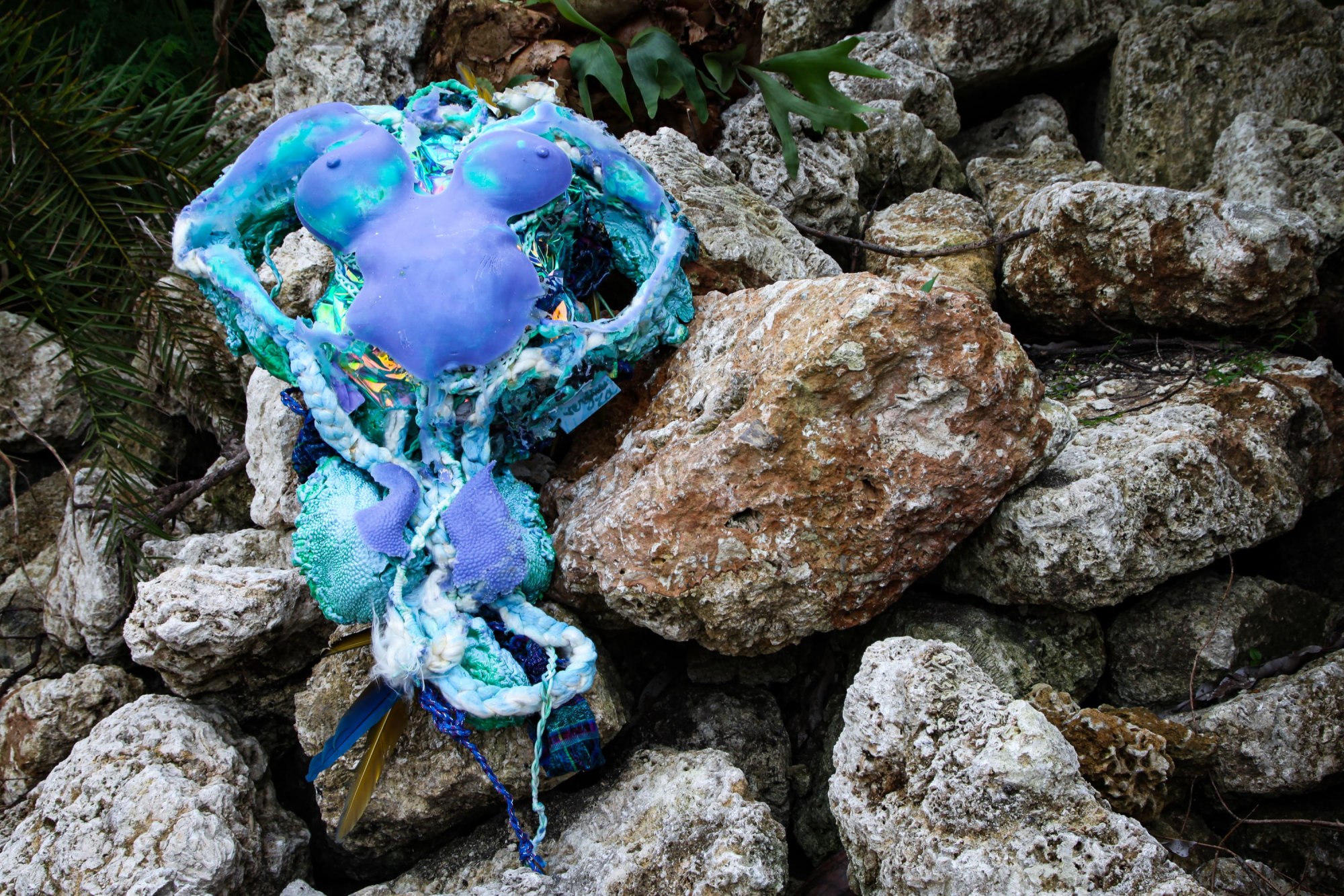 A turquoise and cerulean pregnant figure rests, washed up amidst excavated coralina stone composing the bedrock of the Caribbean. A syncretic pieta between an exotic, synthetic mother and her endemic habitat, the maternal materiality of nature conditions the figure's return to their extant, endemic landscape. The natural and man made materials composed along with the title- refer to the translation between gendered geographies and spiritual traditions of Caribbean cultures surviving the Bermuda Triangle's disappearance.