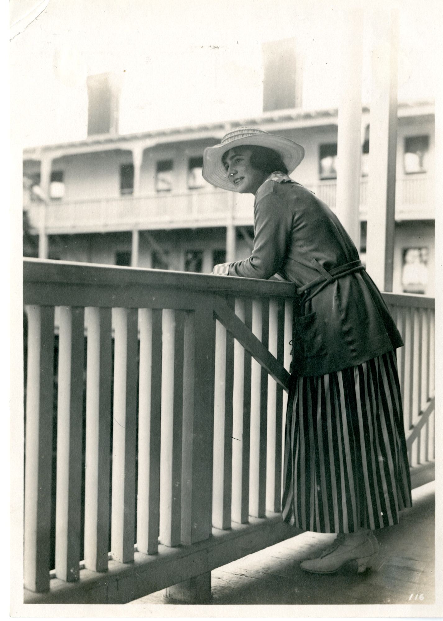 A woman in an early fashion shoot, titled a “Style Show” in the courtyard of the Hotel del Coronado. Date unknown. Coronado Historical Association Collection. Rights reserved.