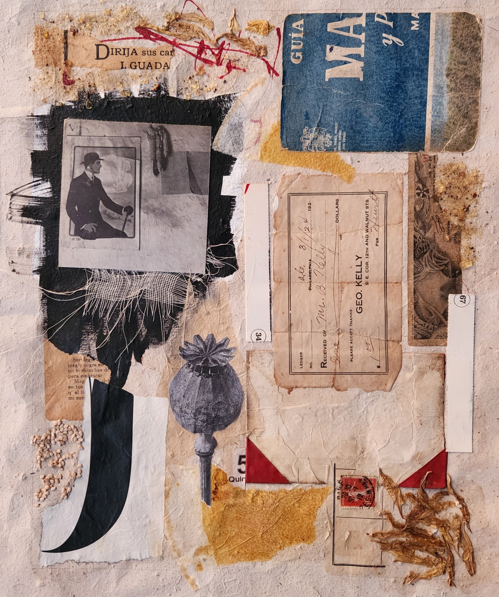 Original mixed media collage, with sunflower petals, copal dust, seeds - framed