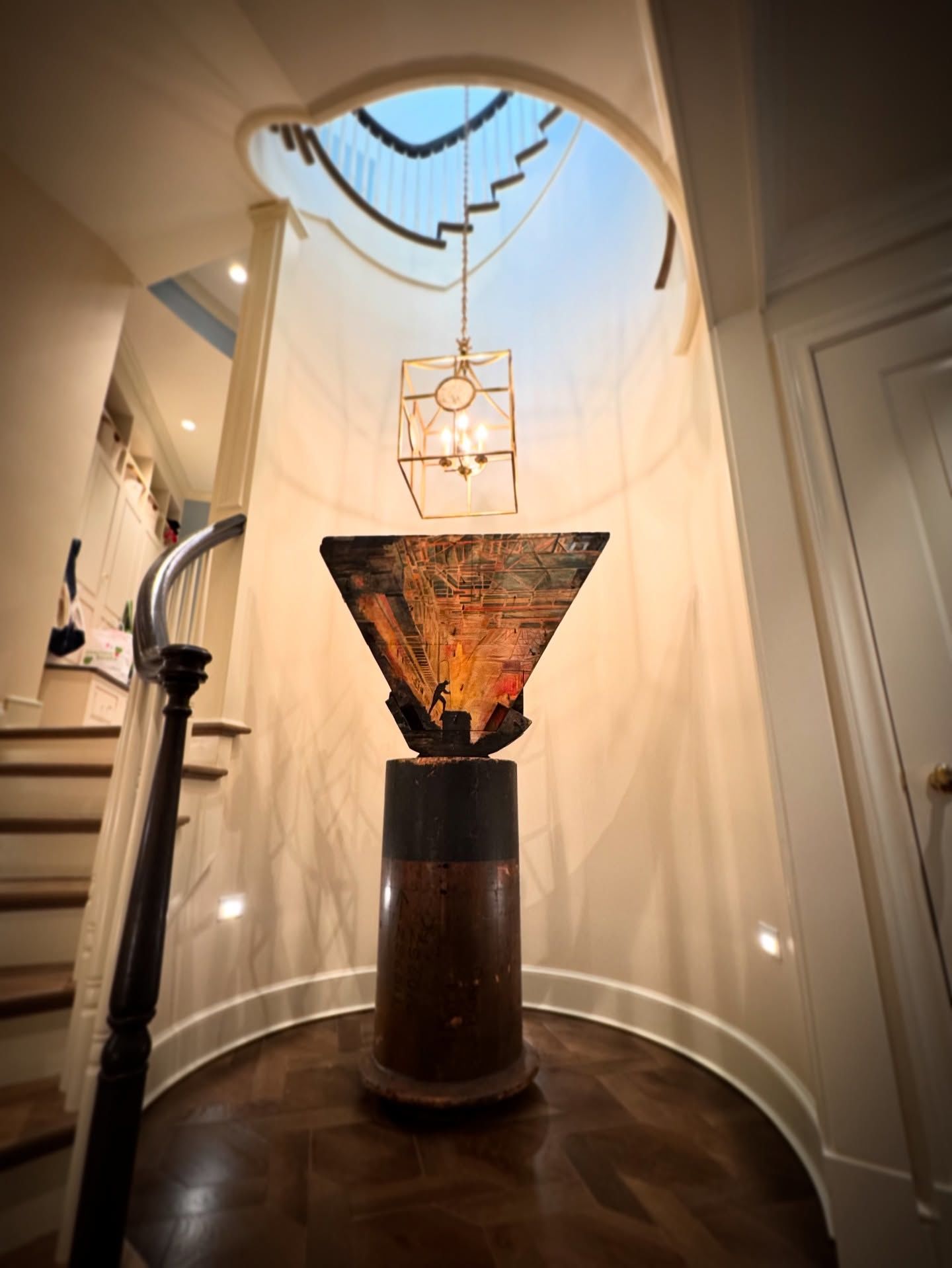 "In Monument to Industry, painted on a trapezoidal piece of plywood with screws shot through from the back, Bonnet uses the shape of the support to funnel the scene into the crucible, where iron becomes steel, and where a worker in silhouette tests the metal—and tests his mettle in the heat. Yet it is equally possible to see the scene exploding out of the crucible, as if the scene is made and shaped by the reason for the mill’s existence. The mills make steel; steel makes the mills."