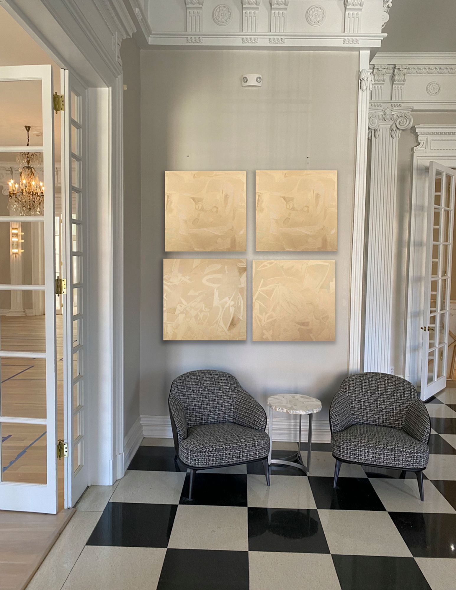The significance of the gold is a representation of LIGHT —inner light or Self and —outer light Universal Oneness. I am unsure if the subtle designs show in the photo(s) of the painting(s). All 4 paintings are still available [we call this a polyptych in the art world] in groups or alone and will bring much joy to your atmosphere.