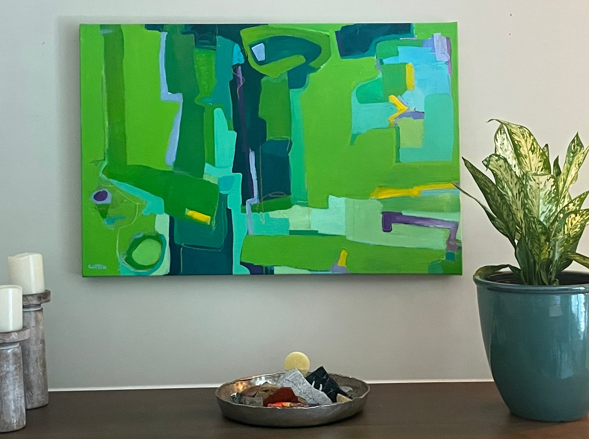 Sharing blue green dominant entries in my sketch book two days in a row led to a person's decision to replace raw current painting over her fireplace. Happy to have been selected as the artist. Enjoy the array of greens and playful marks.