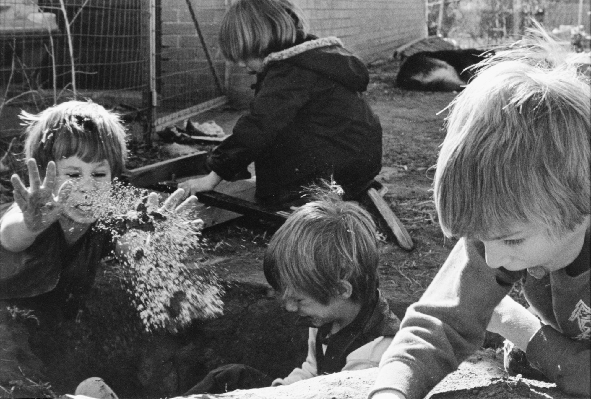 Close up of four children playing in the dirt in front of a brick building and wire fence. One is throwing dirt onto another that is seated in a small hole.