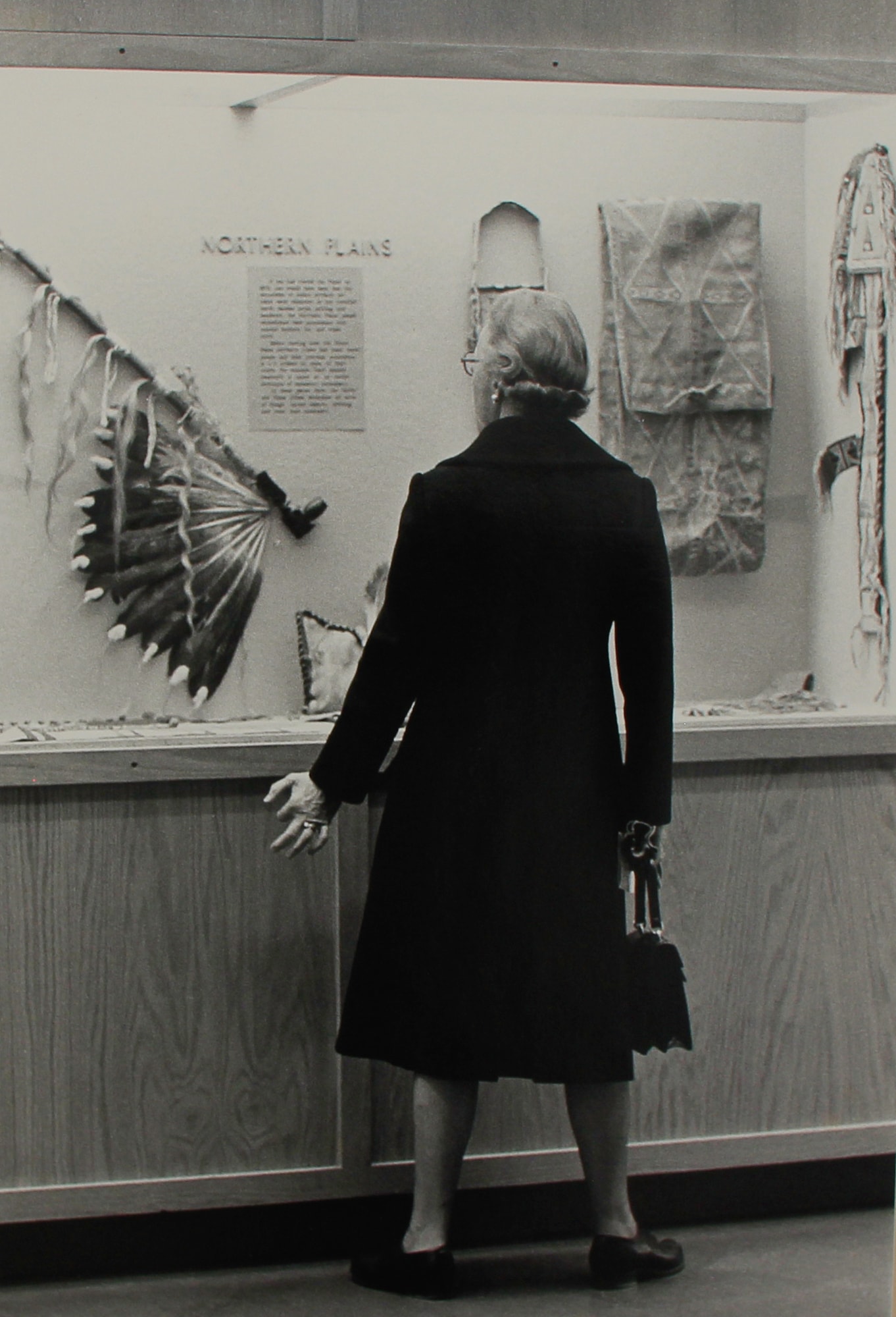 Back of woman in front of "Northern Plains" exhibit display. She is dressed in a long black coat and holding a purse.