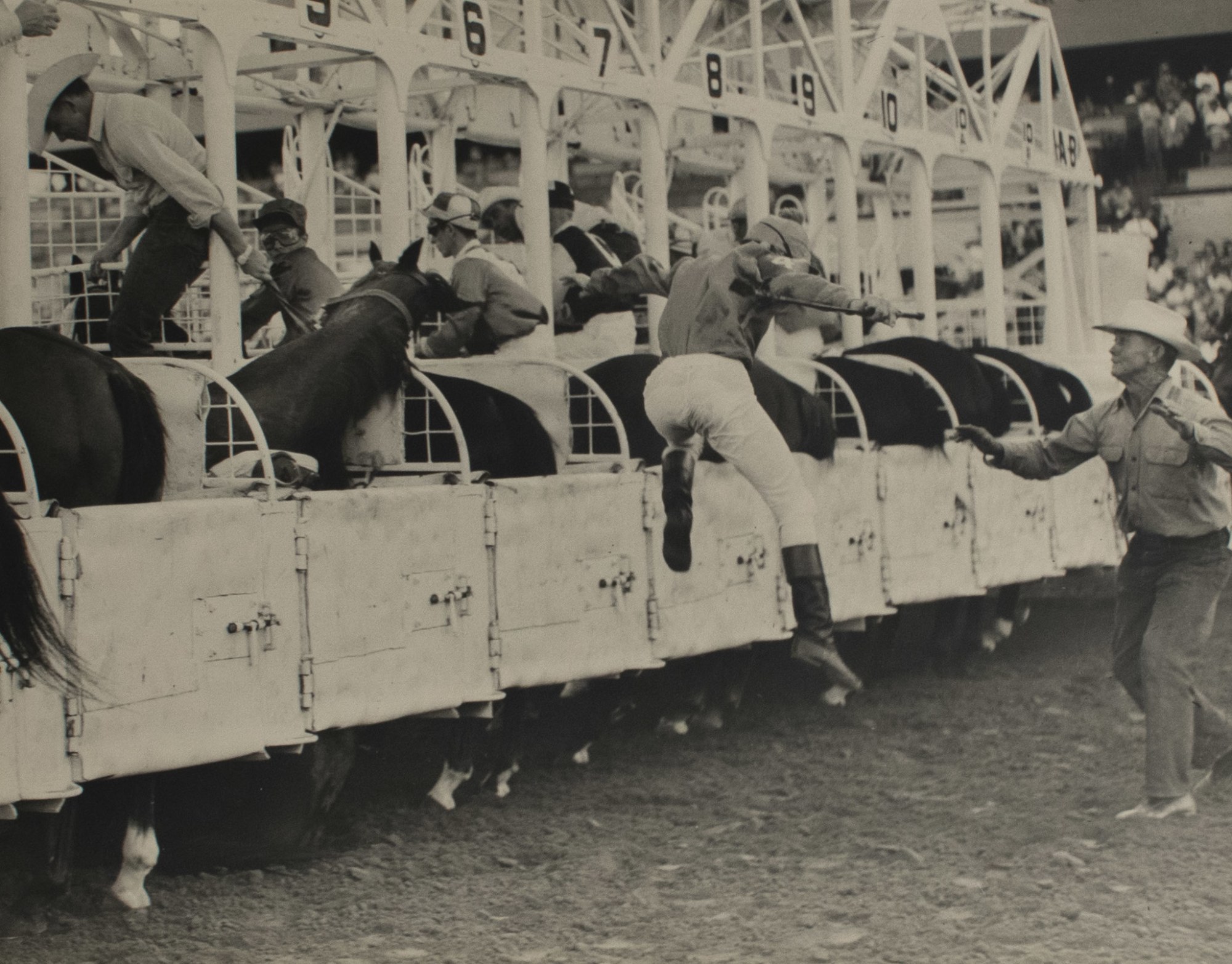A jockey mid-jump in front of the starting gate of a horse race, another man is moving toward him with his hands raised while the other jockeys are mounted on their horses. A blurry crows in stands is visible on the right side.
