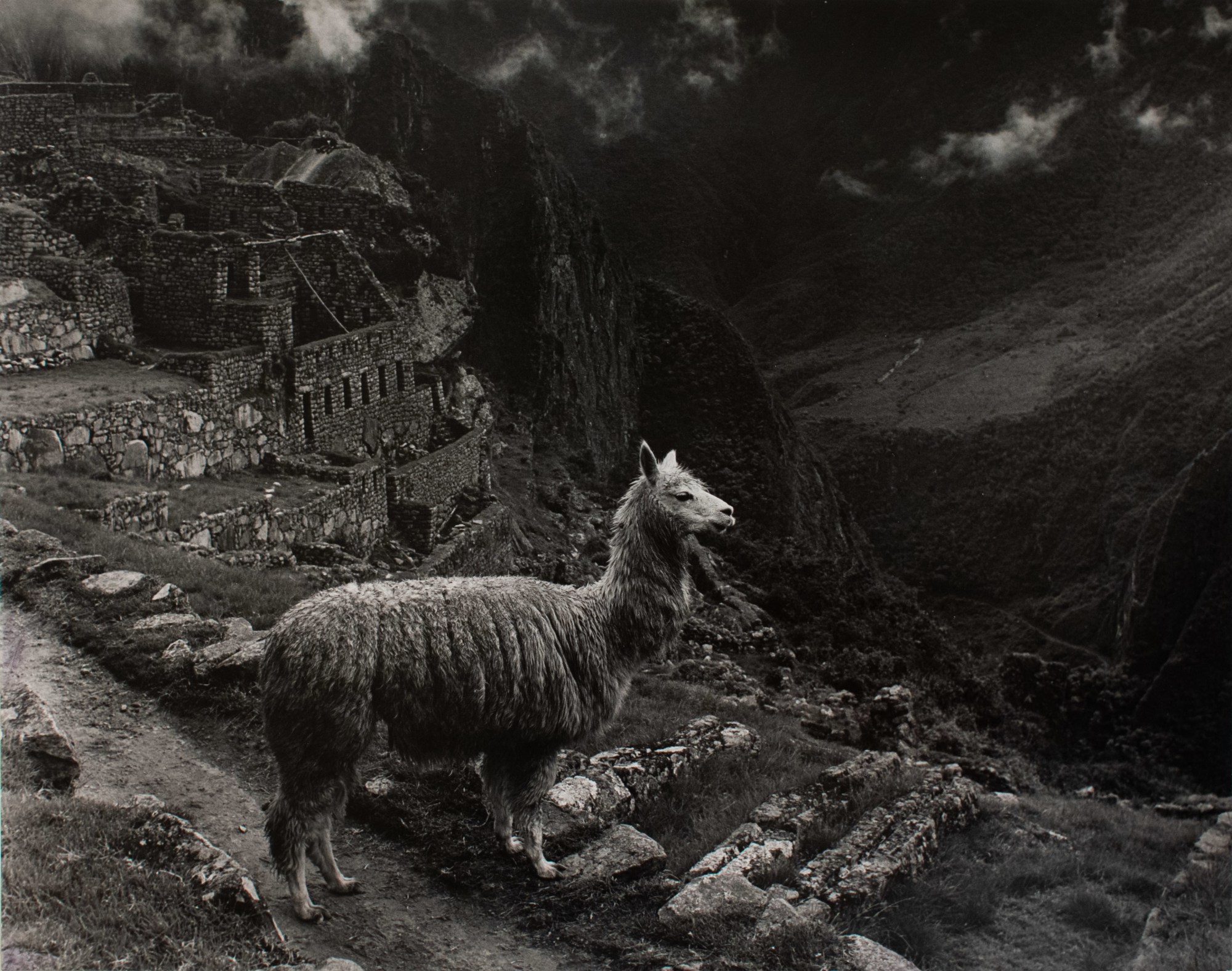 A shaggy llama standing in the ruins of Machu Picchu with crumbling stone walls extending behind it to the left and a deep forested valley to the right. Wispy clouds float around the peaks at the top of the picture.