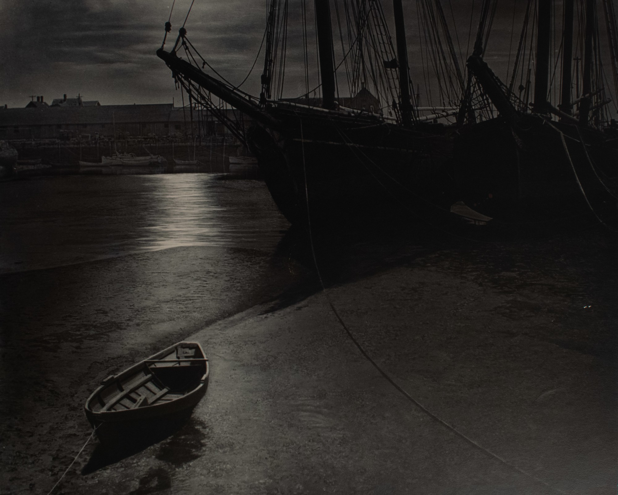 Dark scene of a wooden rowboat resting on the shore in front of the tide. A much larger ship floats in the water behind it with a row of docked boats and buildings visible in the distance.