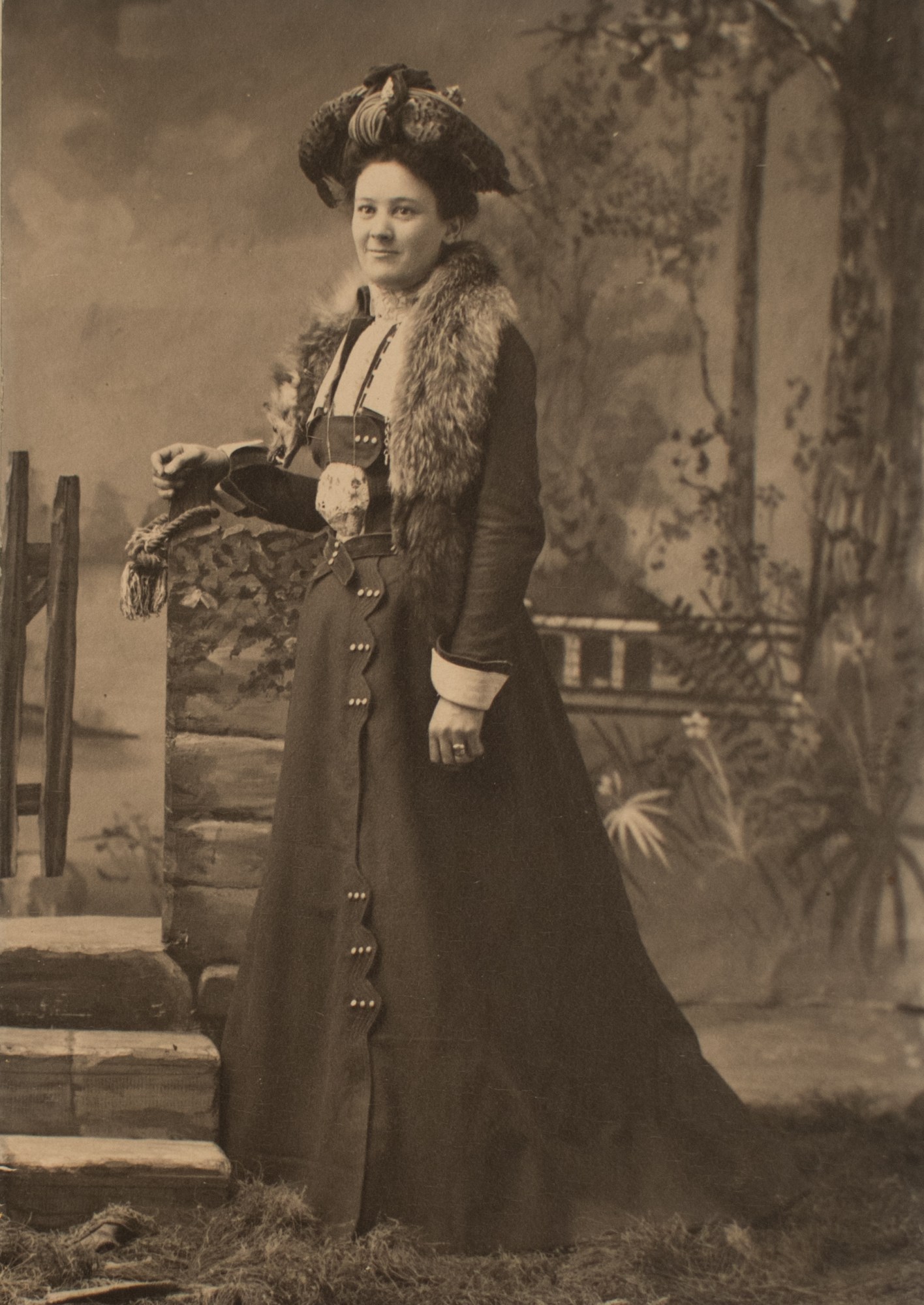 Portrait of a woman dressed up outside. There is a tree in the background.