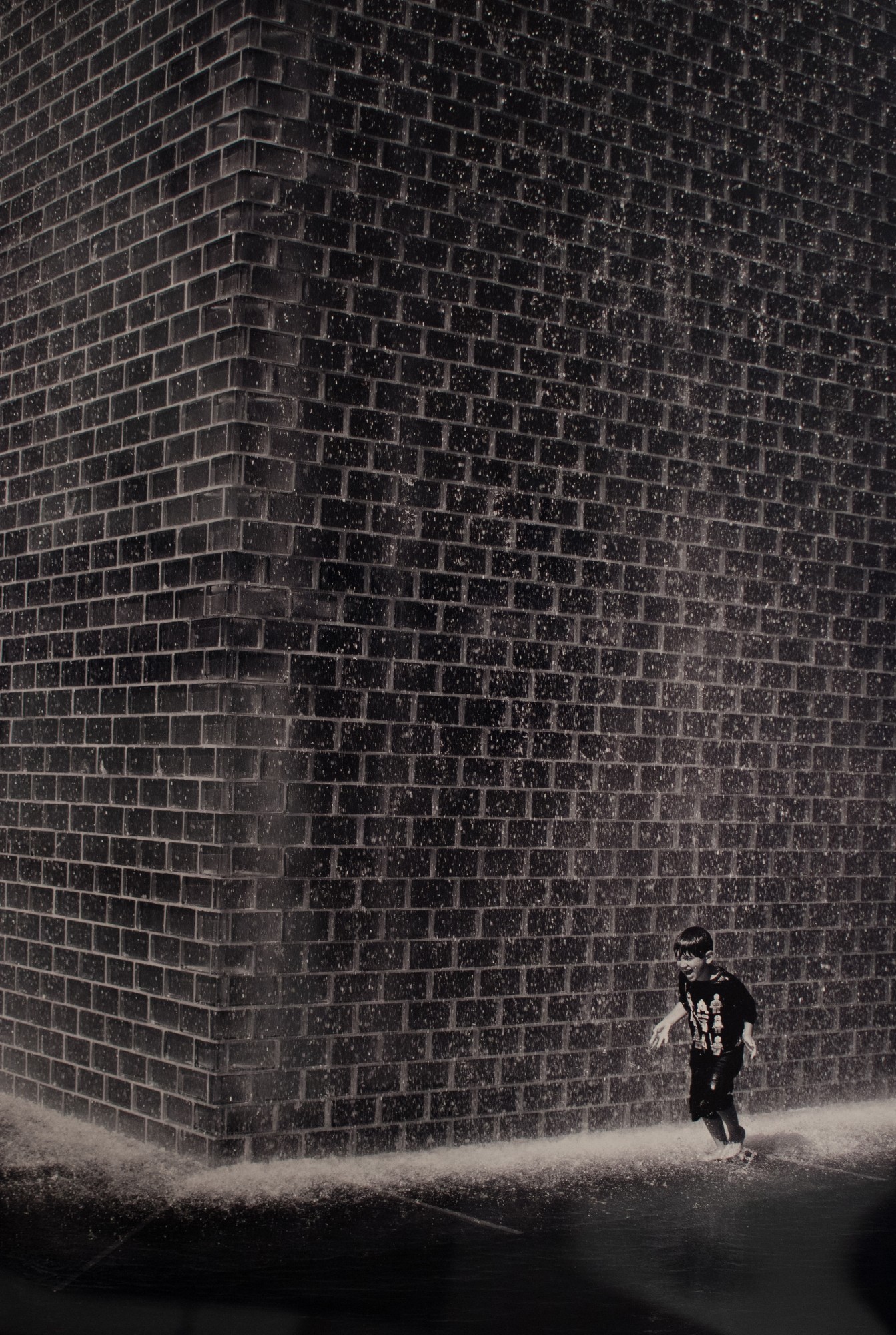 Child running in the rain with a building next to them.