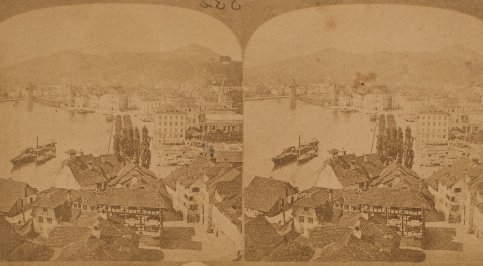 View of Lucerne, Switzerland. There are mountains in the background. There are several buildings.