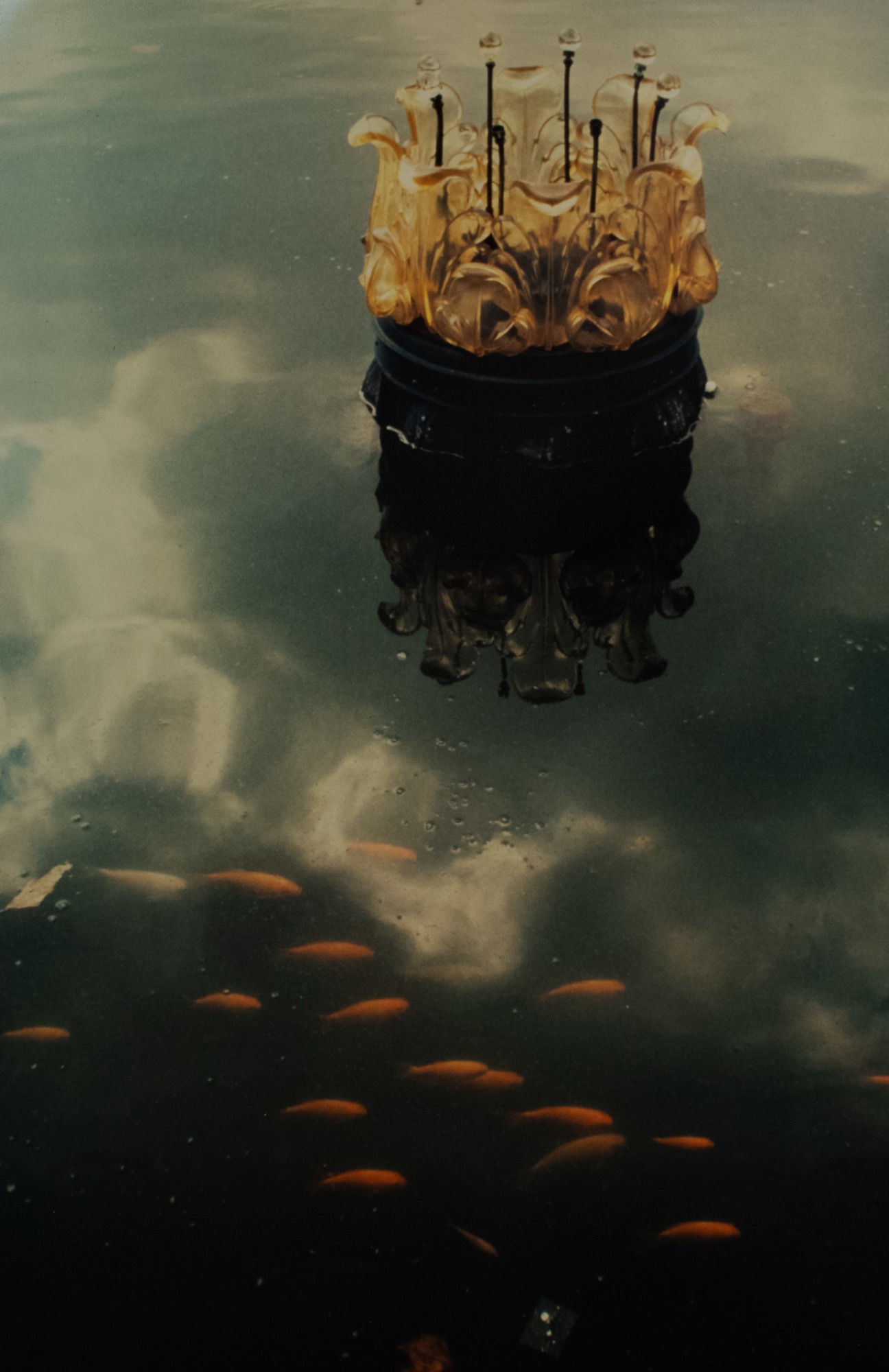 Close-up of fake flower and reflection in pool with small school of goldfish swimming beneath.