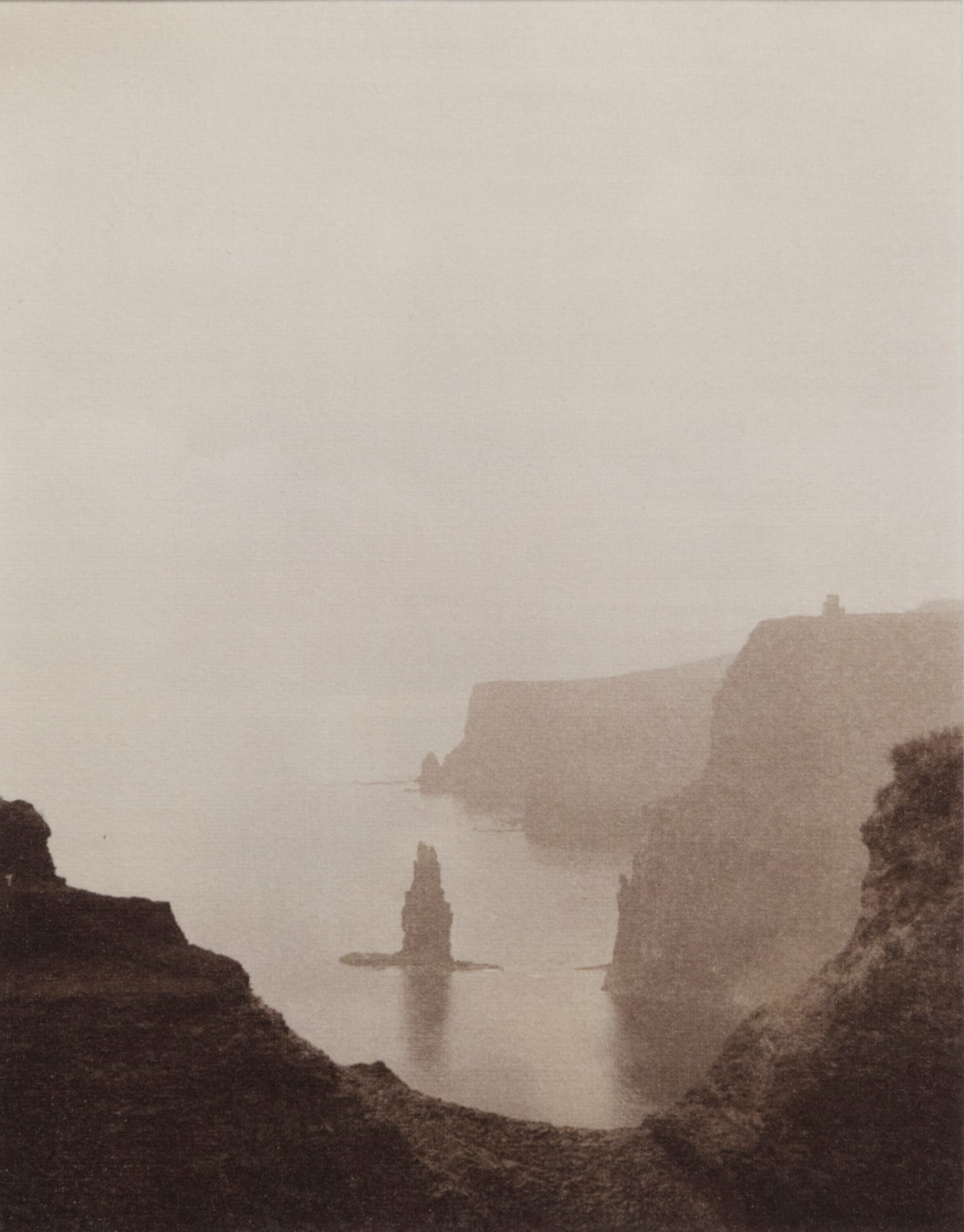 Misty view of bay with tall cliffs and rocks in water, in Ireland