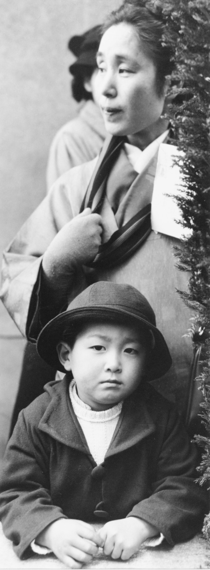 A black and white portrait of two Japanese people, one adult and one child. The adult is standing behind the child and is wearing a traditional kimono. They are looking slightly to the left of the camera. The child is wearing a bucket hat and overcoat. They are staring directly into camera. There is slight foliage in frame from the right of the camera. Behind both figures there is the back of a third adult who is not in frame save for their hair and shoulder.