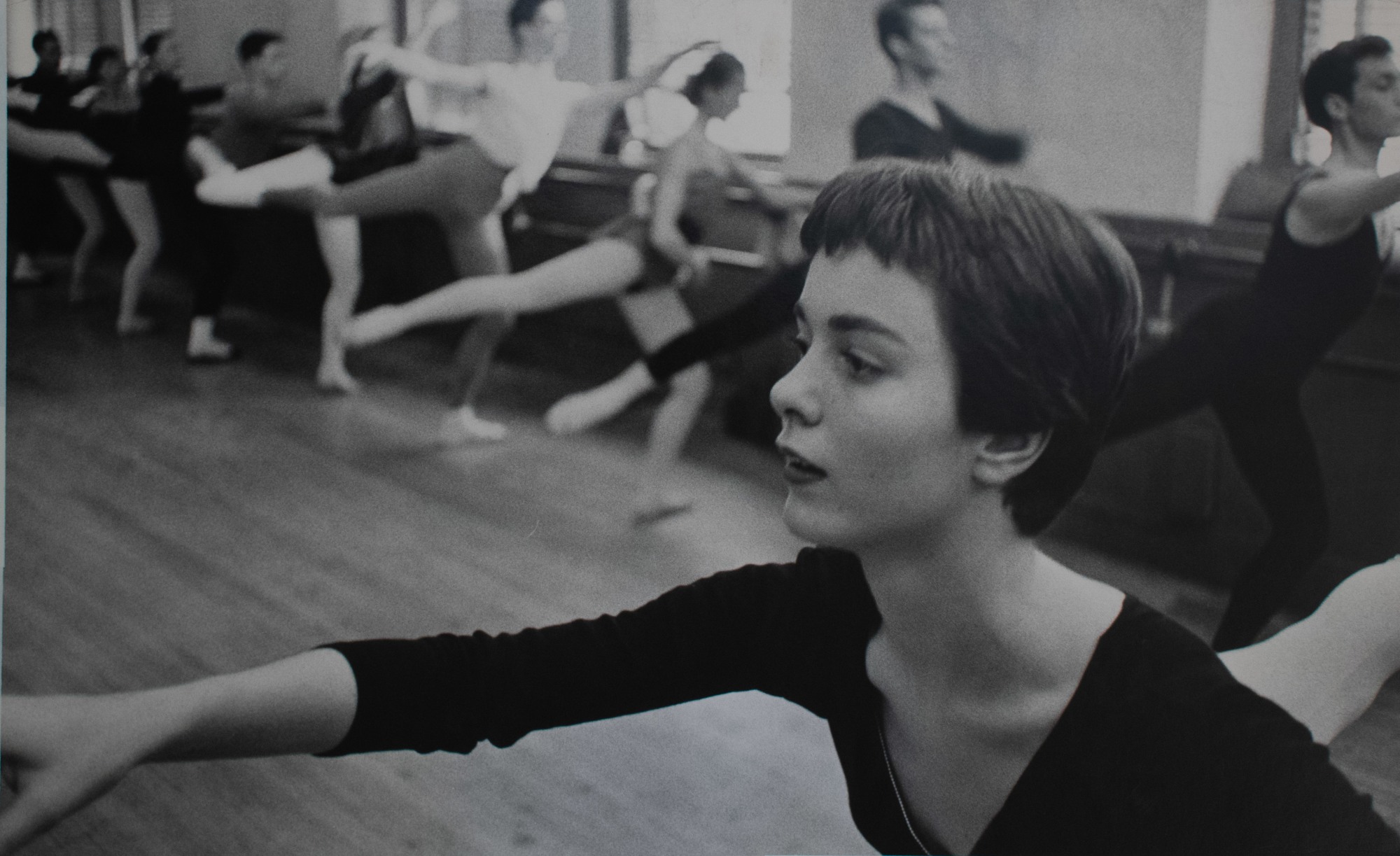A black and white photograph of woman in ballet class. Behind her there are nine other ballet students striking a pose.