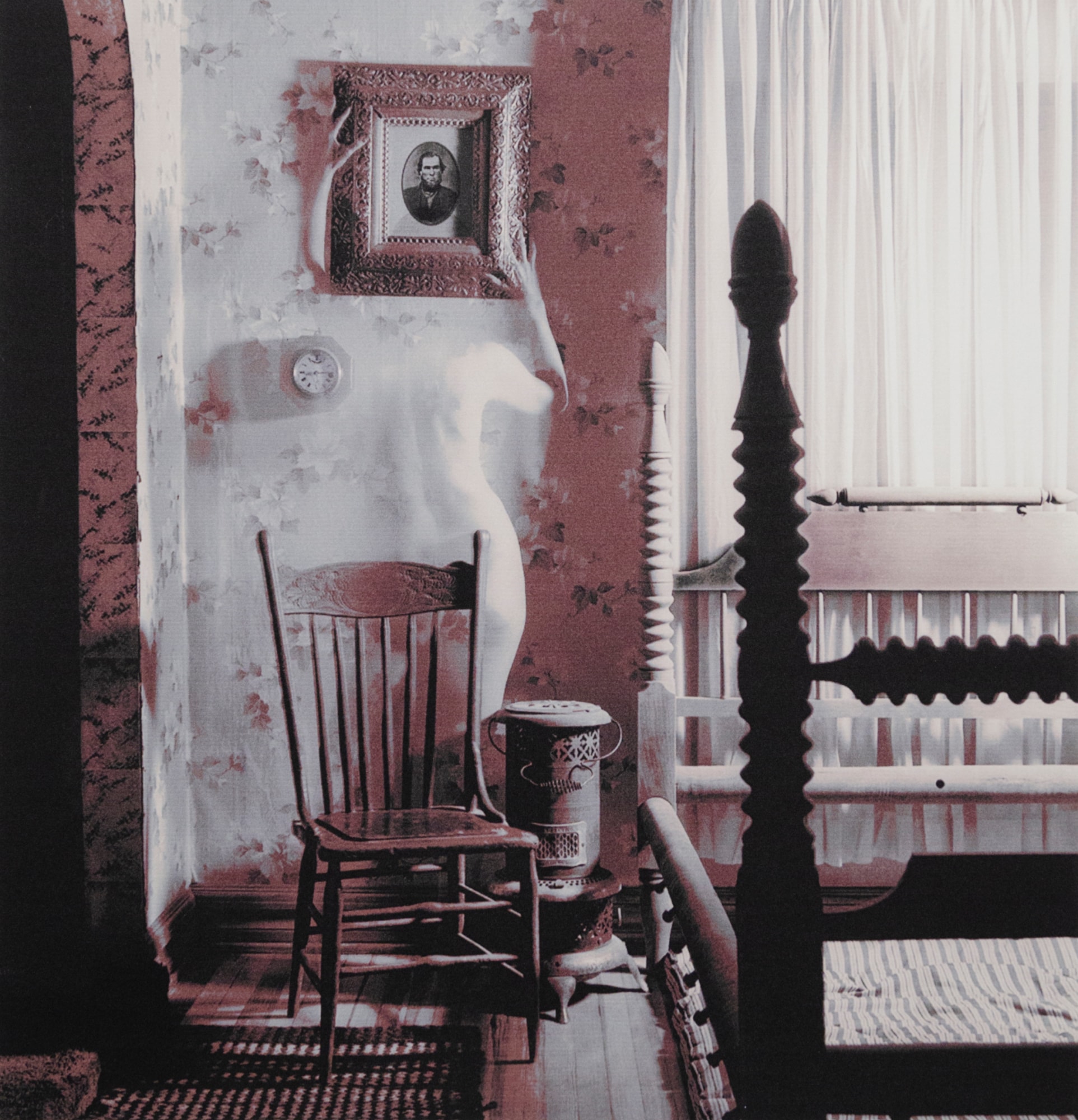 Image of old bedroom with ghostly nude touching a picture on the wall. Digitally toned black and white image.