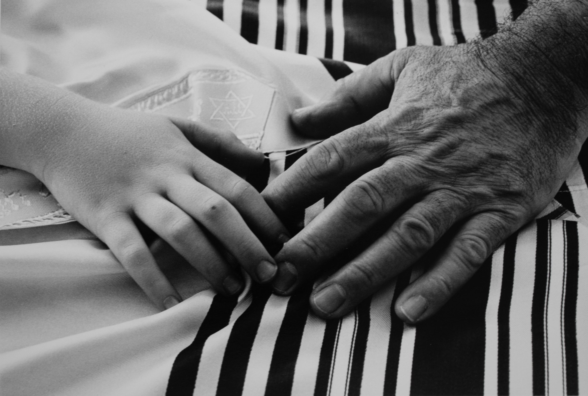 There are two hands, one old one young hand with are laid across Jewish cloth.