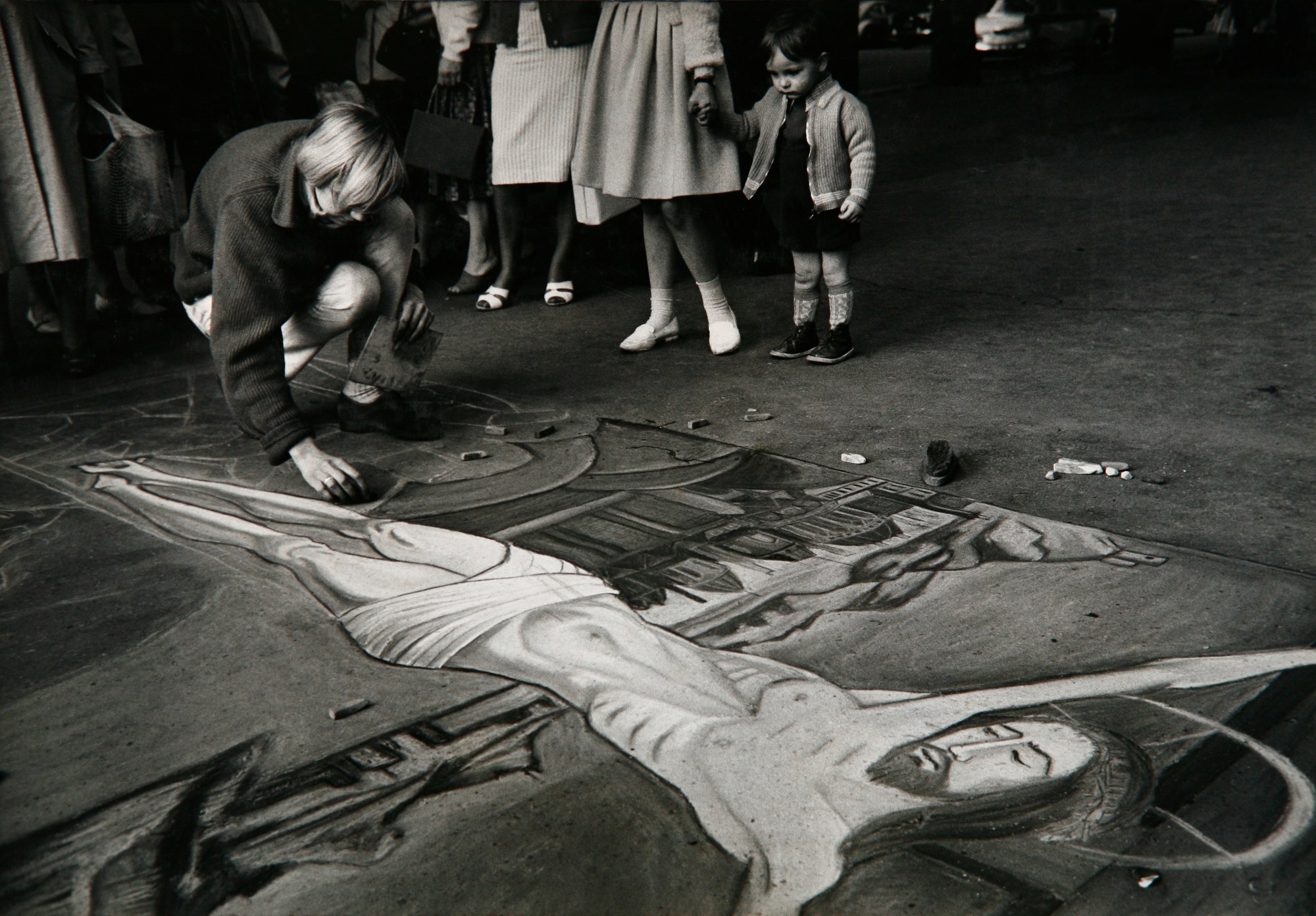 A black and white photograph of a young woman crouching and drawing the crucifixion of Christ on the street. Behind her, a crowd of onlookers watch. The only other individual fully visible in the photograph is a young child holding their mothers hand.