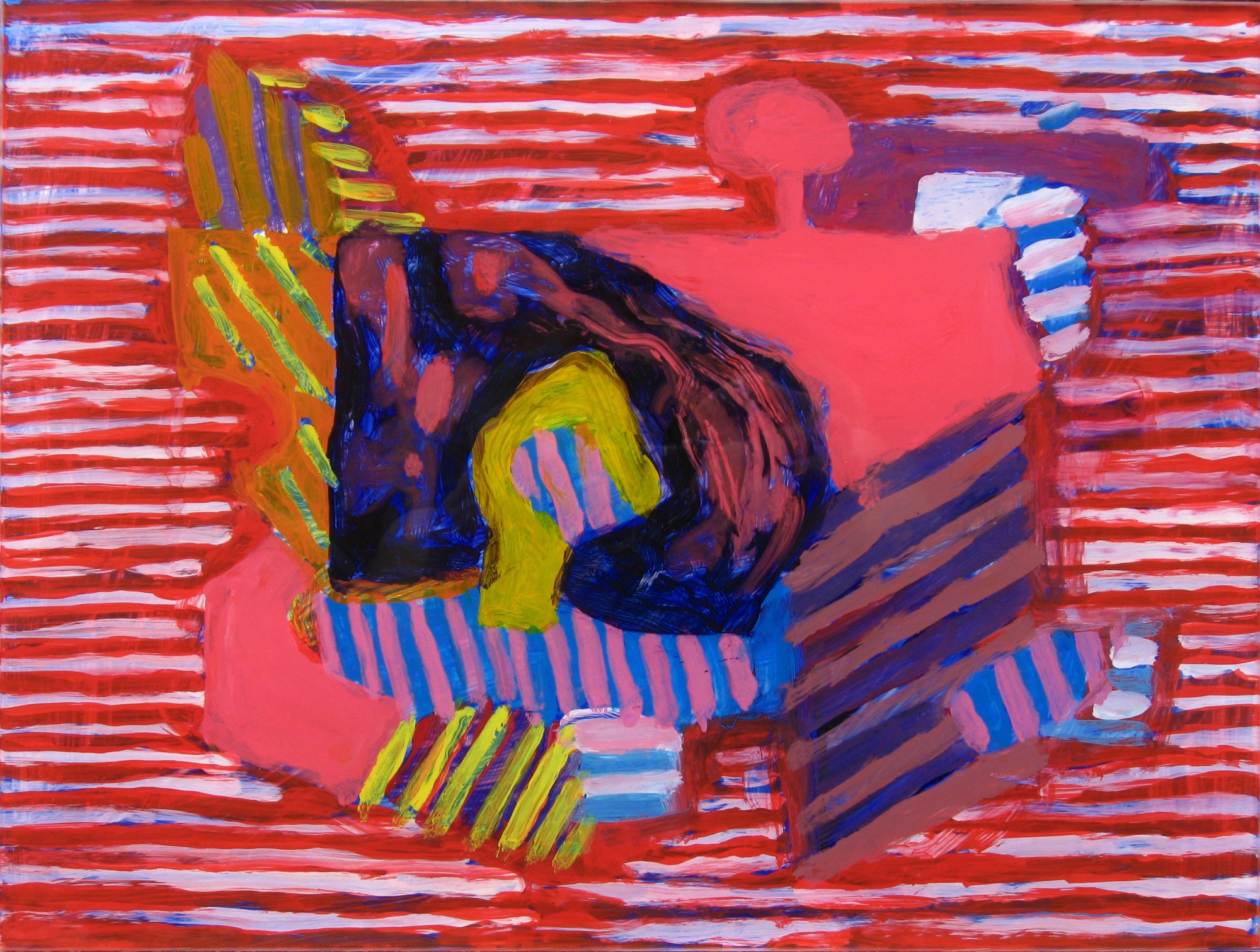This is one of a series of paintings in which I explored the process of painting in reverse. I painted the image on one side of a sheet of plexiglass. The image that's visible to the viewer, however, is the opposite side of the plexiglass. The process allows the artist to create some very exciting visual effects that the artist cannot achieve using traditional media and processes.
