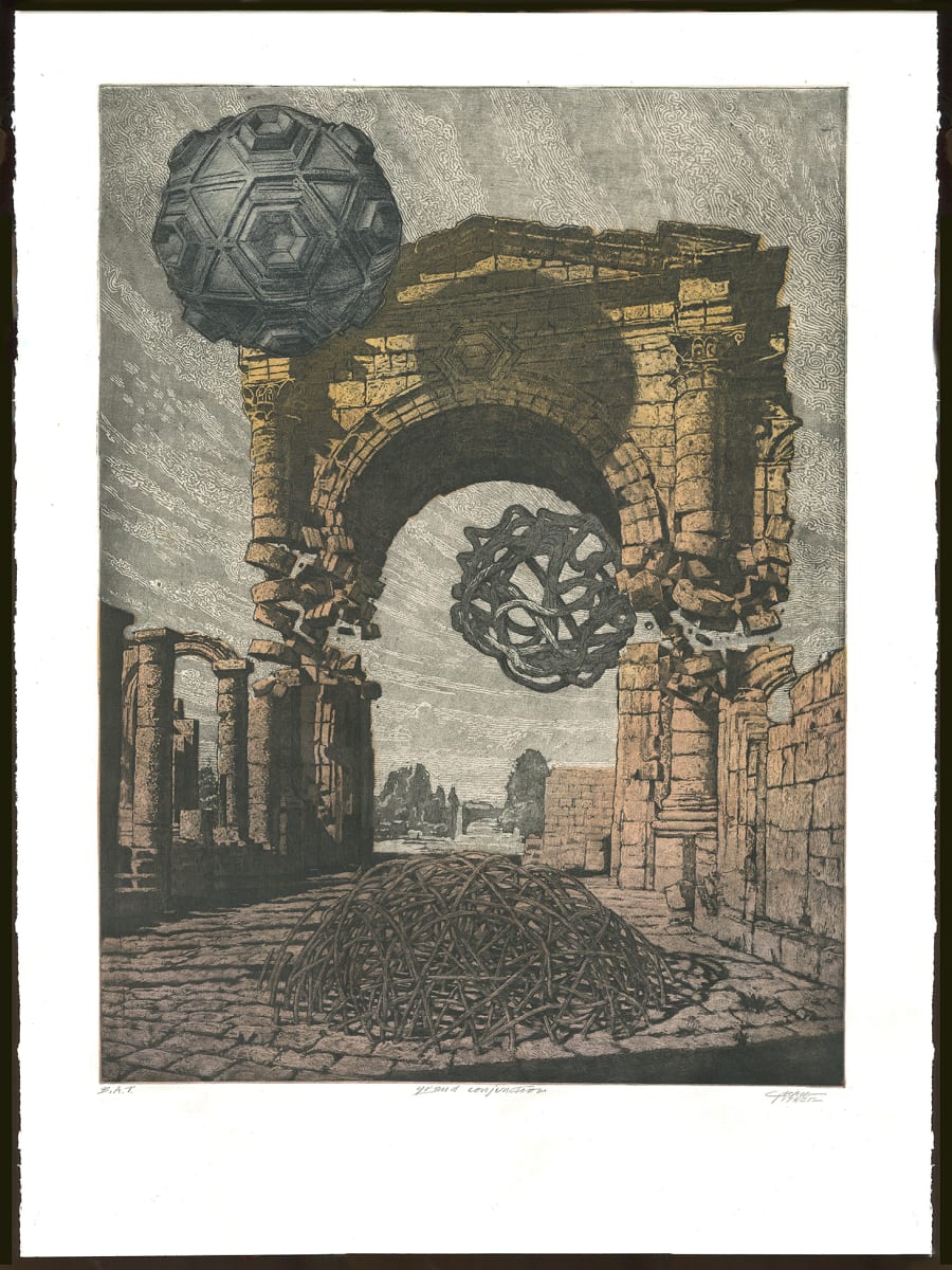 Edition was printed on Arnhem 1618 . The Entire edition had the color elements printed using Japanese woodblocks on Thai kozo. These were then fixed to the intaglio eating etching in the printing process. One B.A.T. was pulled from the edition