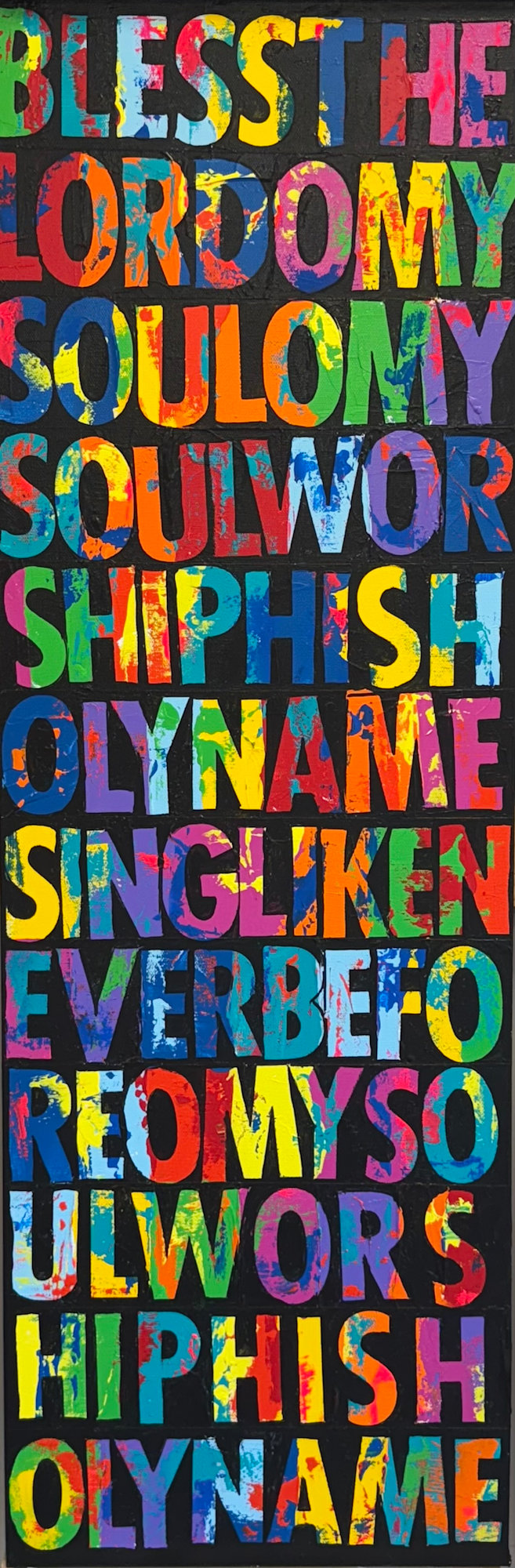 This original 12x36” canvas captures the prayerful spirit of the song in bold, vibrant tones — each letter a visual act of praise. Let this piece be a daily reminder to bless His name with all your heart!