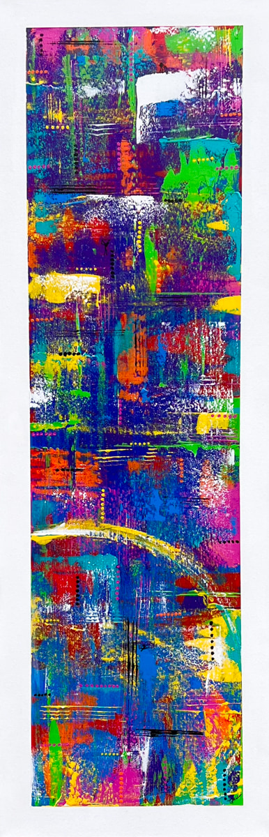 "Sinfonia" is a vibrant embodiment of music translated onto canvas. The interplay of colors, lines, and curves converges to create a magnificent Italian symphony of visual splendor. 12x36" original painting. Can be exhibited alone or as a triptych with Concertina and Consonanza.