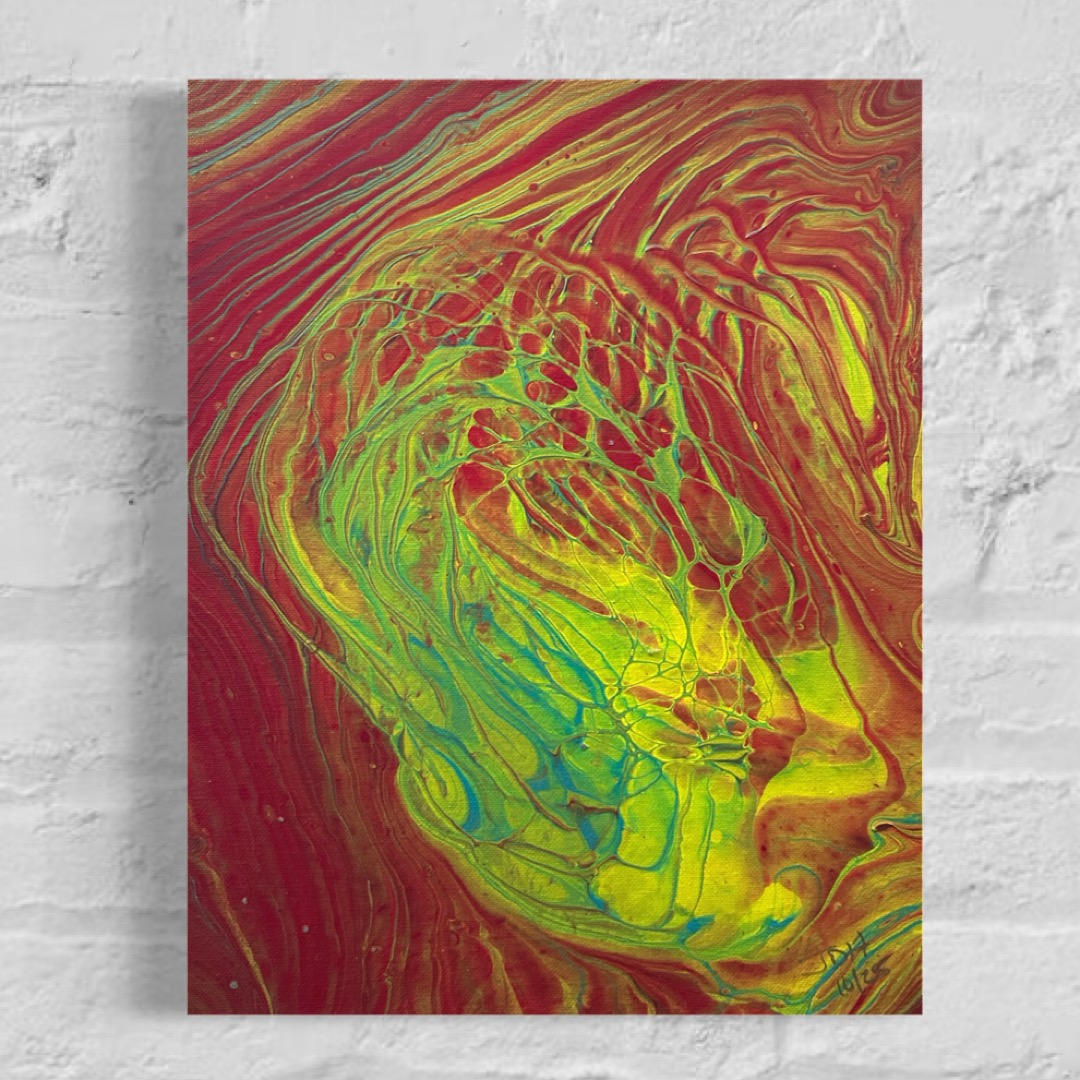 In Chrysalis Echo, Caribbean blue and yellow converge into a bright, electric green — a cocoon of light suspended in motion. Copper, blue and green ripple around it like fragments of memory, while red hums beneath the surface, anchoring the transformation. The piece captures the quiet tension between becoming and reflection — a pulse caught between what was and what’s about to emerge.