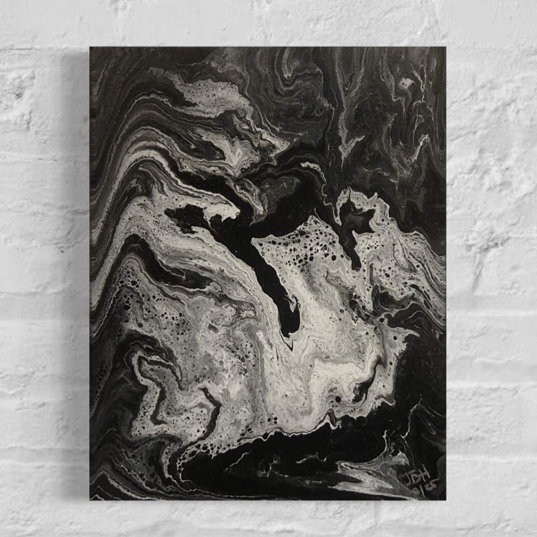 Salt and Shadow maps a monochrome coastline of light and dark, where velvety blacks meet foaming whites in tidal motion. Lacework cells sparkle like sea‑salt crystals, while inky pools carve shifting coves and headlands across the surface. The high‑contrast flow balances hush and drama, inviting the eye to drift, return, and find new forms with every pass. A refined, modern statement piece—minimal in palette, expansive in mood.