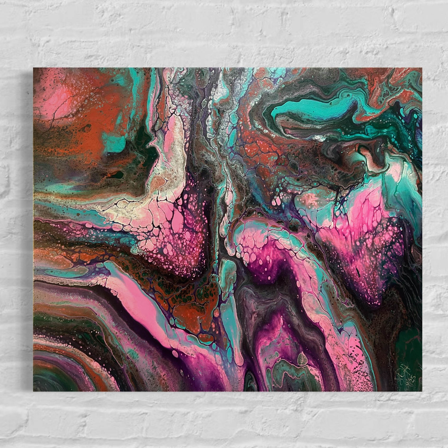 A celestial rift blooms across the canvas, where stardust meets storm and dreams fracture into color. Veloraeth evokes a world beyond realms, a place where fuchsia flares and seafoam shadows collide in graceful chaos. Veins of maroon and teal pulse like ancient energy, while glimmers of light whisper secrets only the stars remember. It is not merely a painting—it is a portal to the unseen.