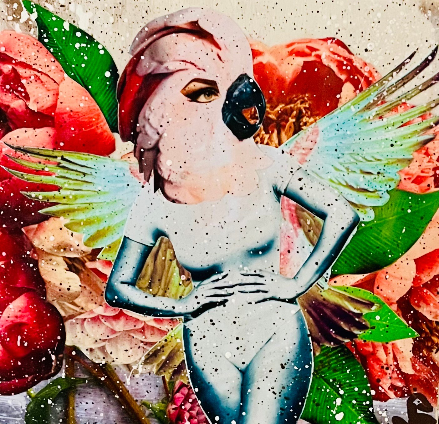 8’’X8’’-Original Collage, images from recycled magazine material, found reimagined images, analog collage artwork by on boxed wood canvas matted Unframed, 2024. Artist Cristina Sayers
