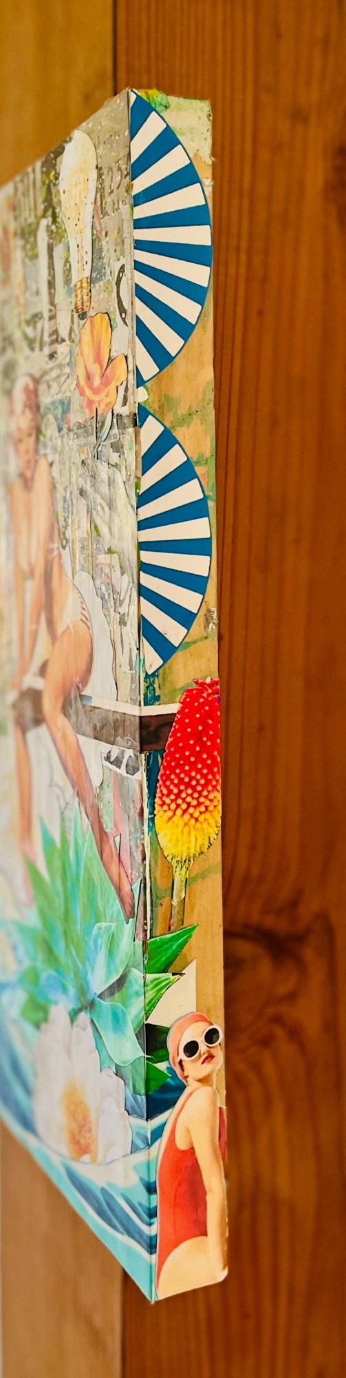Original Collage, images from recycled magazine material, found reimagined images, analog collage artwork by Artist Cristina Sayers; 16’’x20’’, on boxed wood canvas matted Unframed, 2024