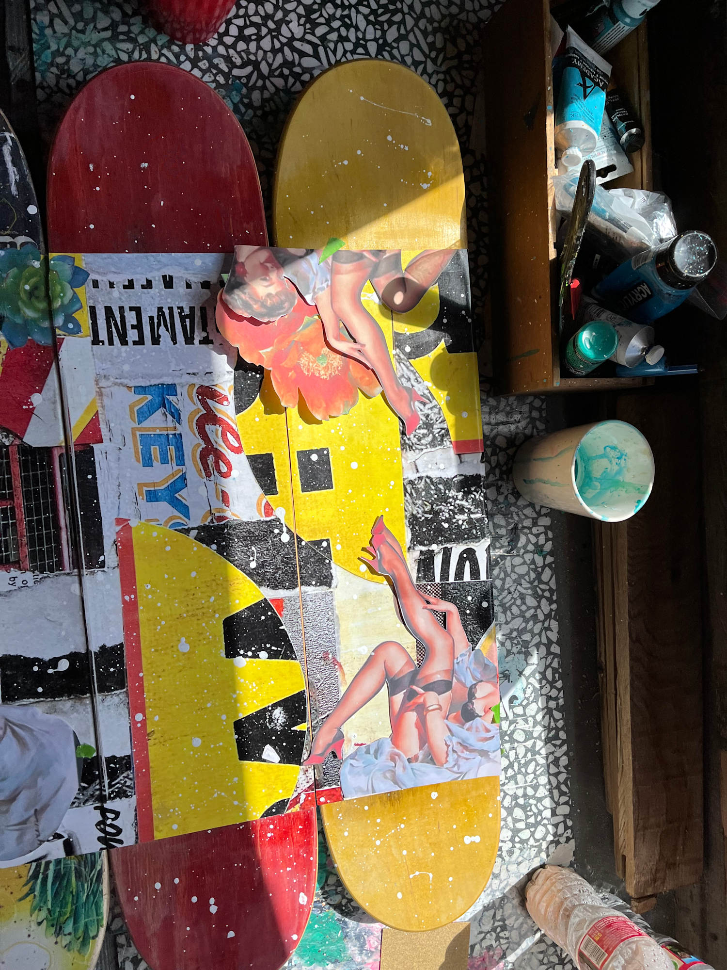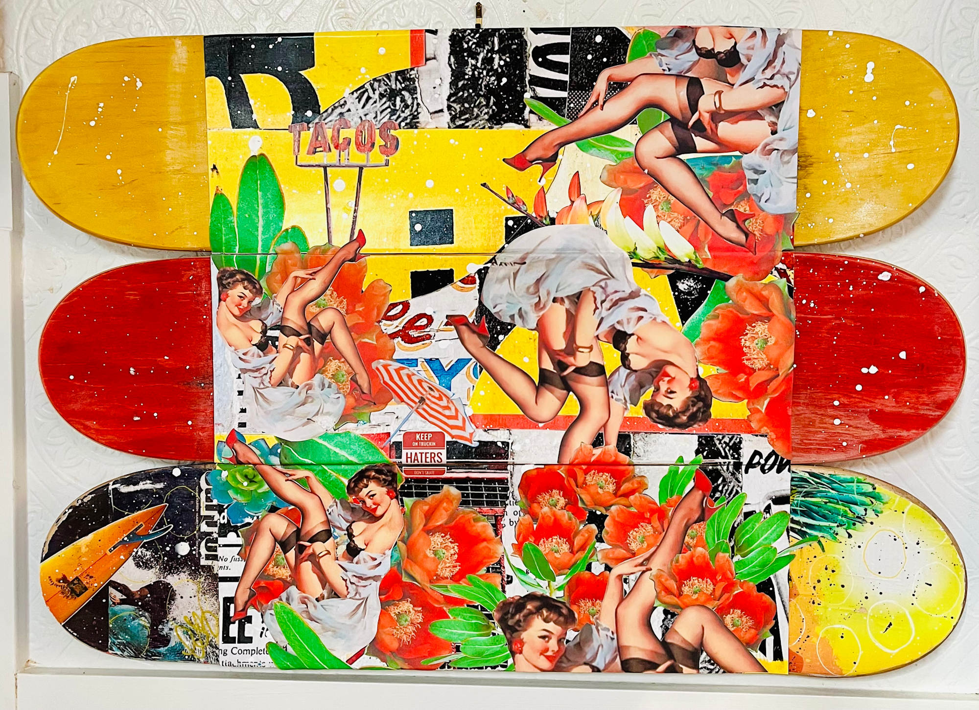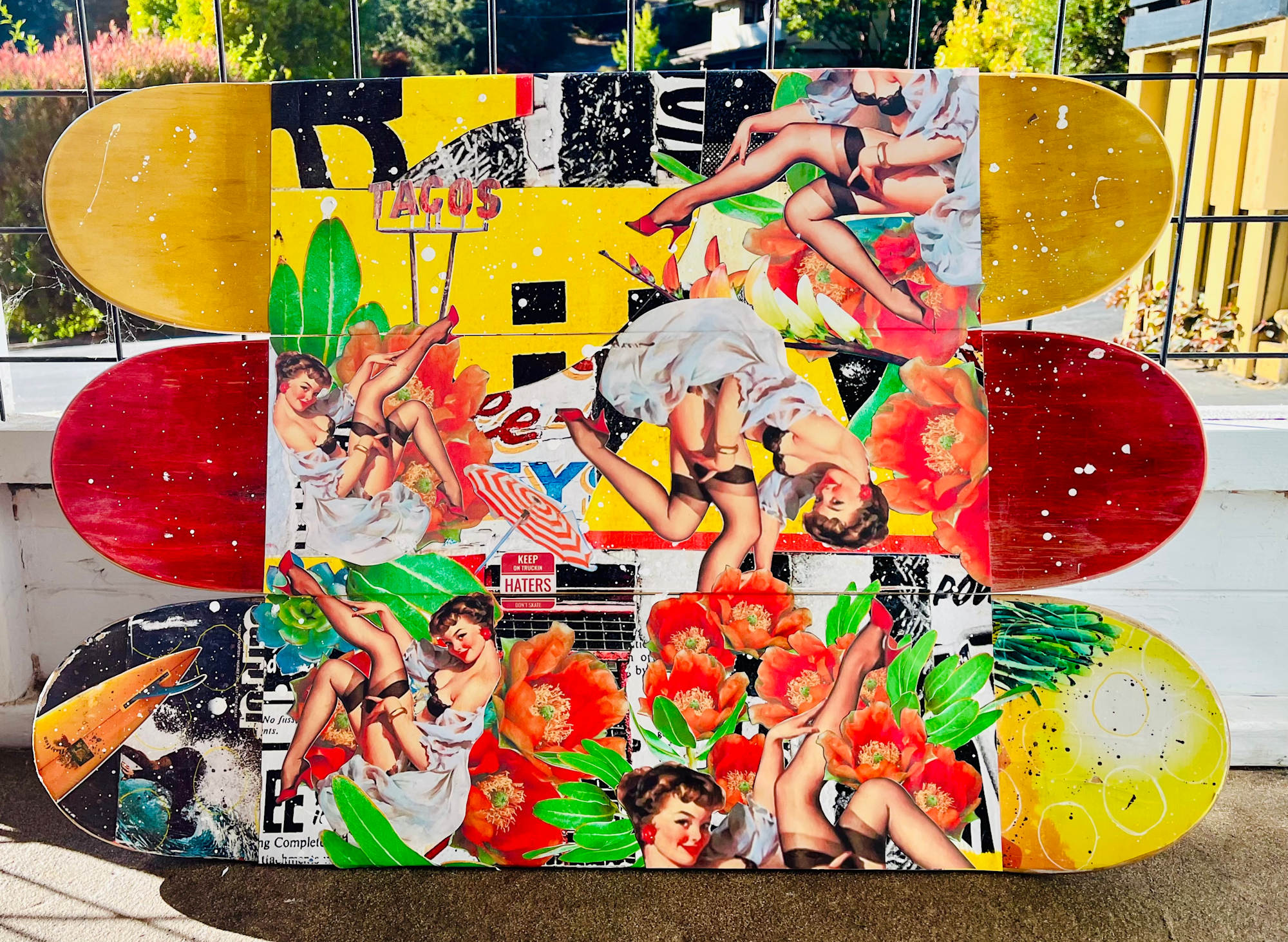 Could this fusion of color and vintage imagery connect with the pop art movement? Utilizing skateboards as a backdrop, the artwork melds pin-up figures with vivid floral patterns and urban elements. The playful arrangement of figures contrasts with prominent typography and street-inspired graphics, creating a lively exchange within the piece. Explore how each element coexists, from the nostalgic allure of mid-century art to the contemporary edge of mixed media. This assemblage from curated images from recycled calendars or magazines, invites viewers to delve into the captivating intersection of retro aesthetics and modern artistic expression, reminiscent of influential pop art explorations. How does this combination of past and present inform our understanding of visual culture?