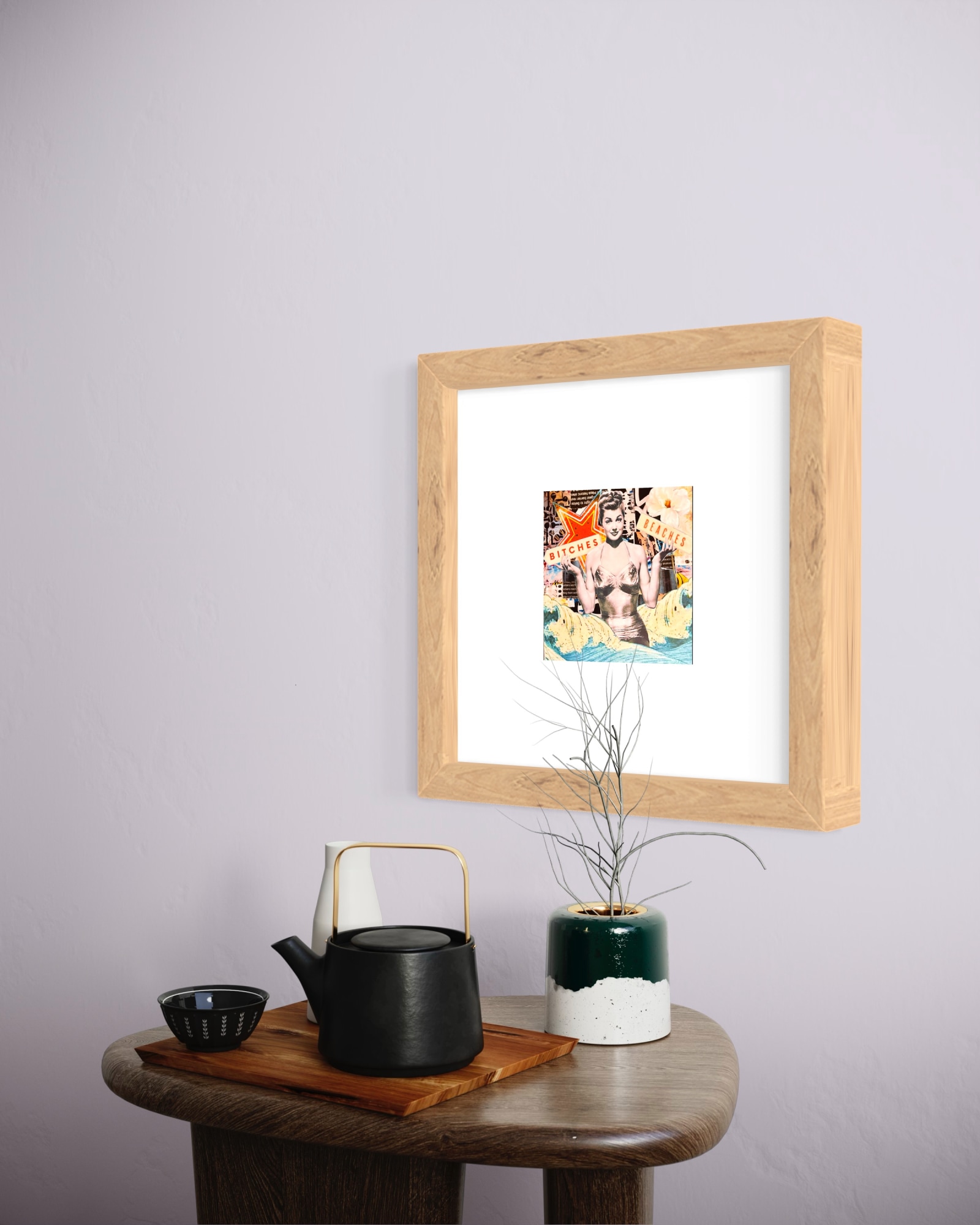 Original Collage, images from recycled magazine material, found reimagined images, analog collage artwork by Artist Cristina Sayers; 8”x8” for n cotton flat canvas, matted Unframed, 2023.