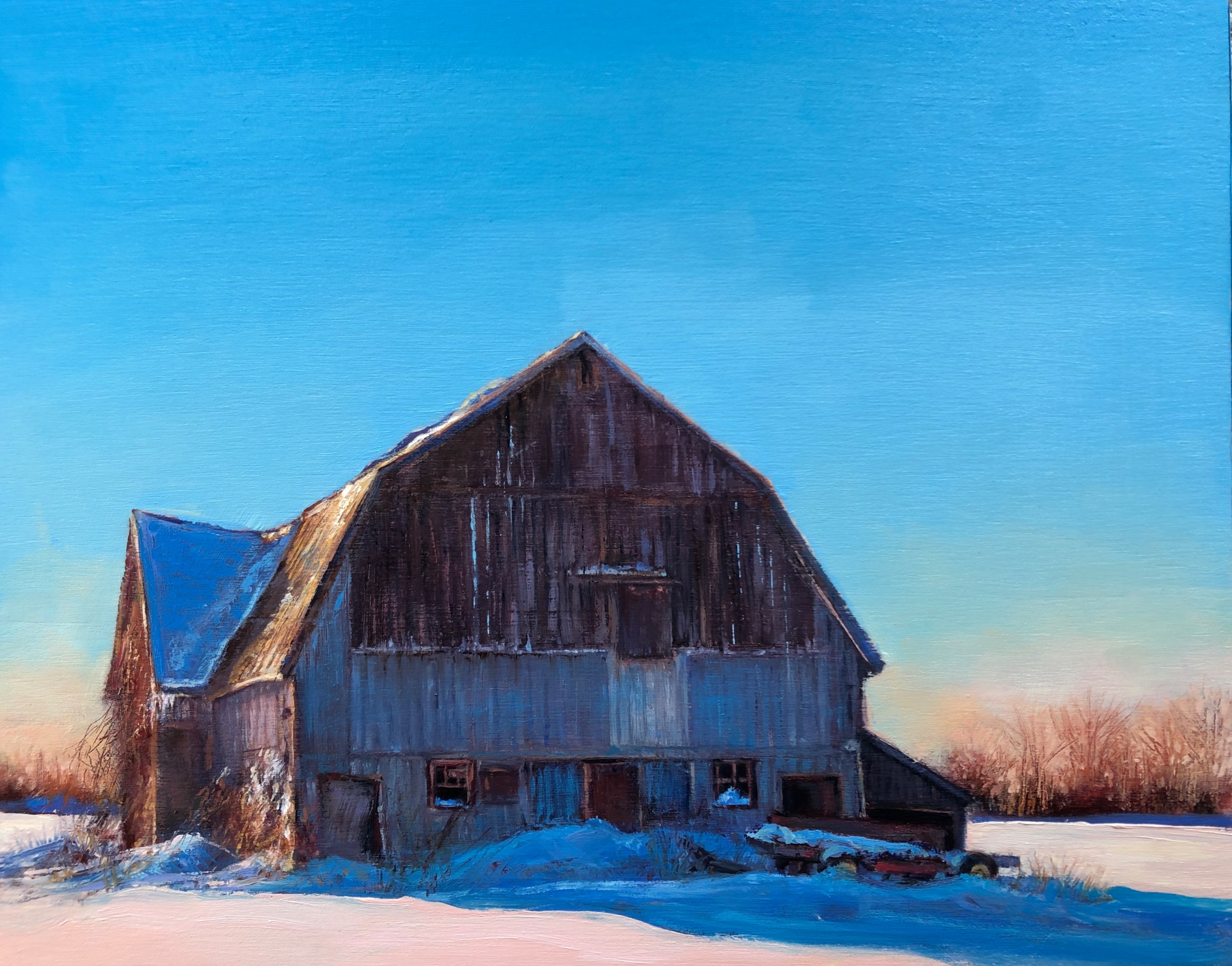 My husband and I love to drive the country roads near where we live which is where I find my photogenic subjects. Golden hour and blue hour in winter yield magnificent reflections of colour on the surface of snow. In this painting I was drawn to the light in both the warm and the cool use.