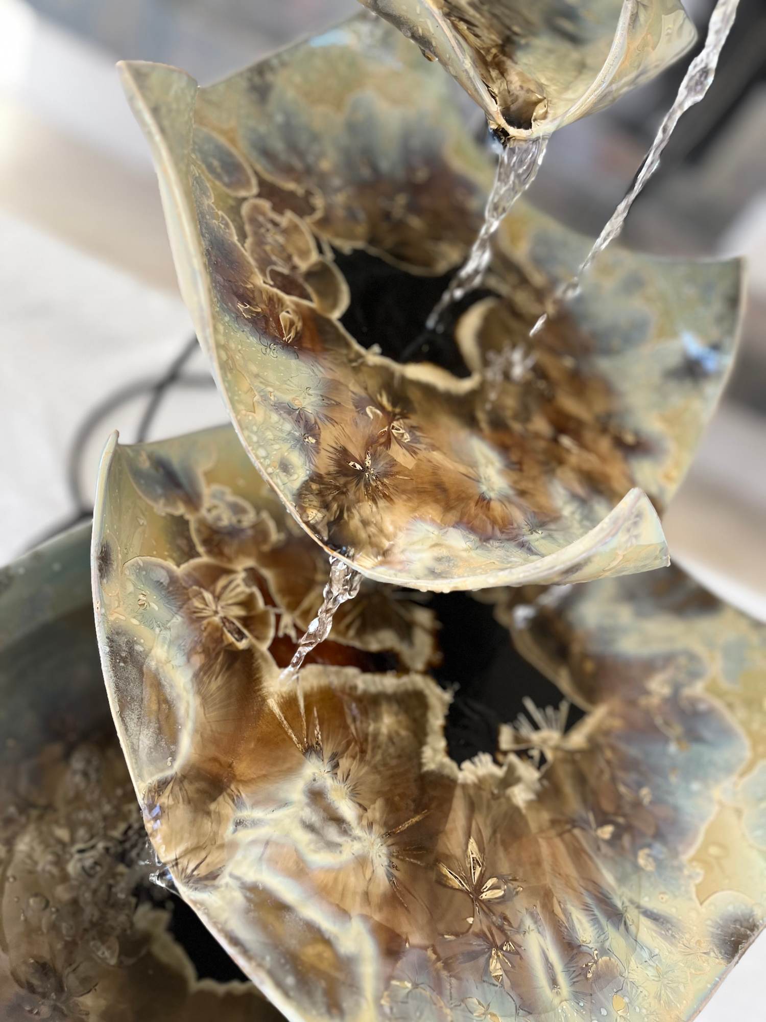 Each part of this fountain was crafted using a slab roller to cut pieces of porcelain clay. I then hand-molded and sculpted the elements to guide the water in natural, flowing patterns and directions. The golden crystal glaze completes the vision I aimed to portray, adding a luminous final touch to the design.