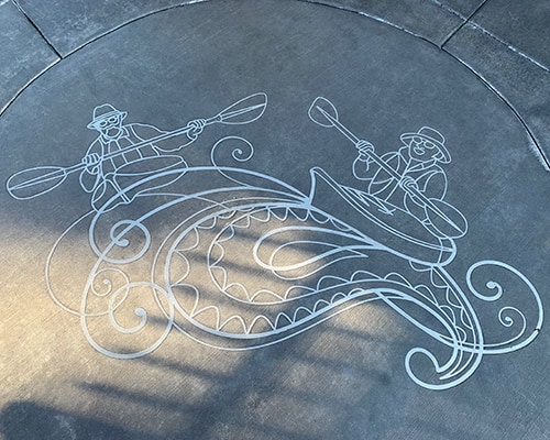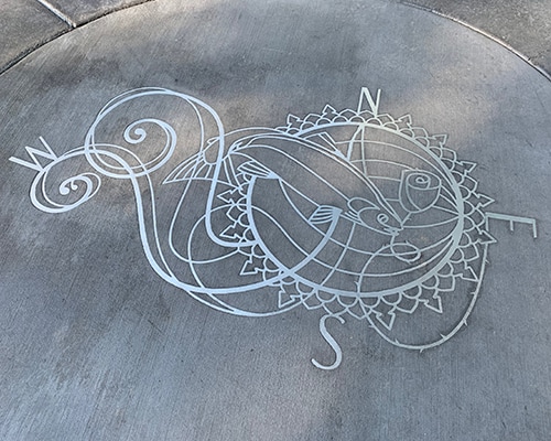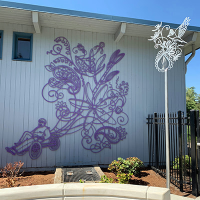 Camas Kaleidoscope is an expansive metalwork installation that weaves through all of Campbell Community Center’s newly redesigned courtyard spaces. These interrelated art elements include wall reliefs, kinetic sculptures, and concrete inlay work. The pieces are linked together visually through a shared vocabulary of whimsically illustrative imagery, celebrating Eugene’s historic legacy of free-spirited arts and culture.