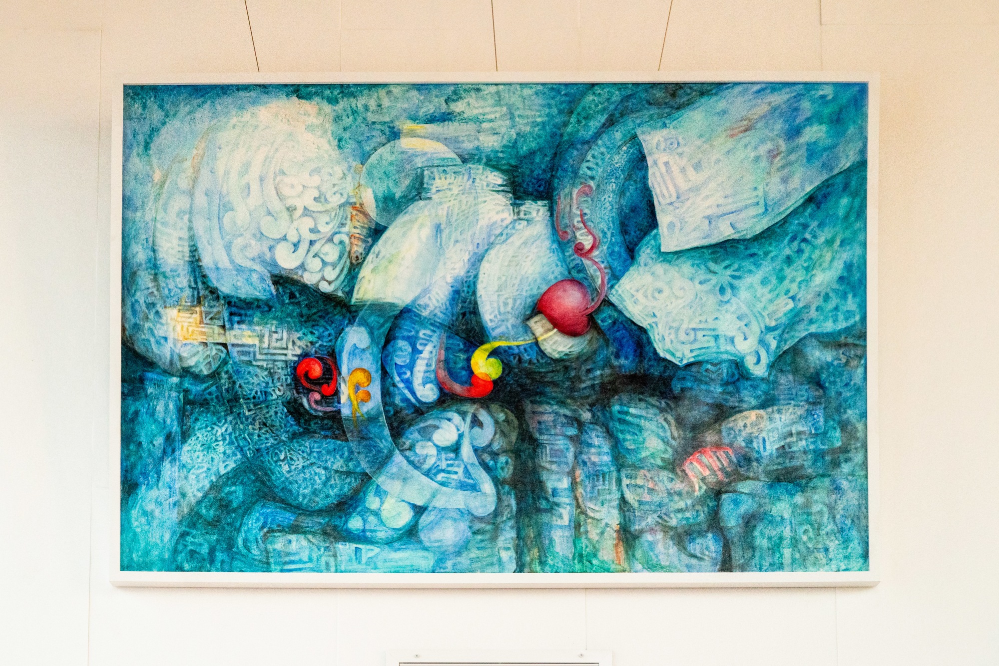 “Dreaming Patterns in Blue Space” engages the interplay of coded cultural motifs with patterns, symbols and letters that act as vessels of universal beauty and reveal the essence of existence. Informed by her Korean heritage and life in Eugene, Kum Ja explores the symbiotic relationship between temporal flow and spatial perception. This dialogue between past and present, embodied in translucent layers, expresses the poetics of continuity. Through subtle shifts in blue hues and traditional patterns, the work conjures nostalgic memories of engraved motifs from Kum Ja’s childhood that evoke a traditional Korean aesthetic submerged in the oceanic expanse of her imagination.