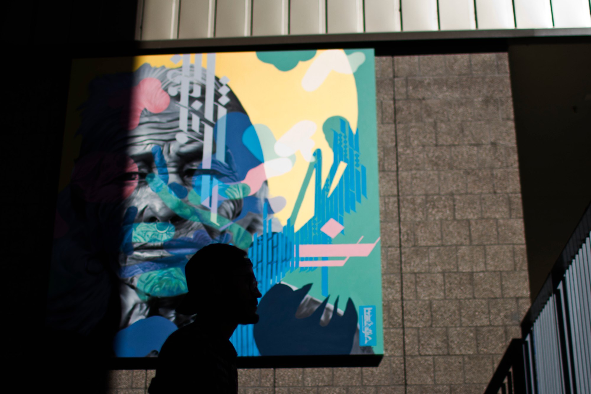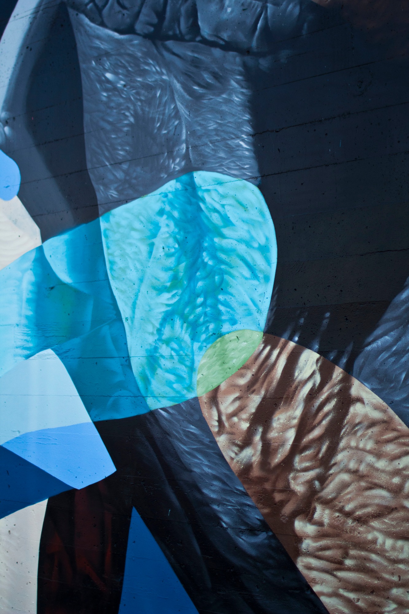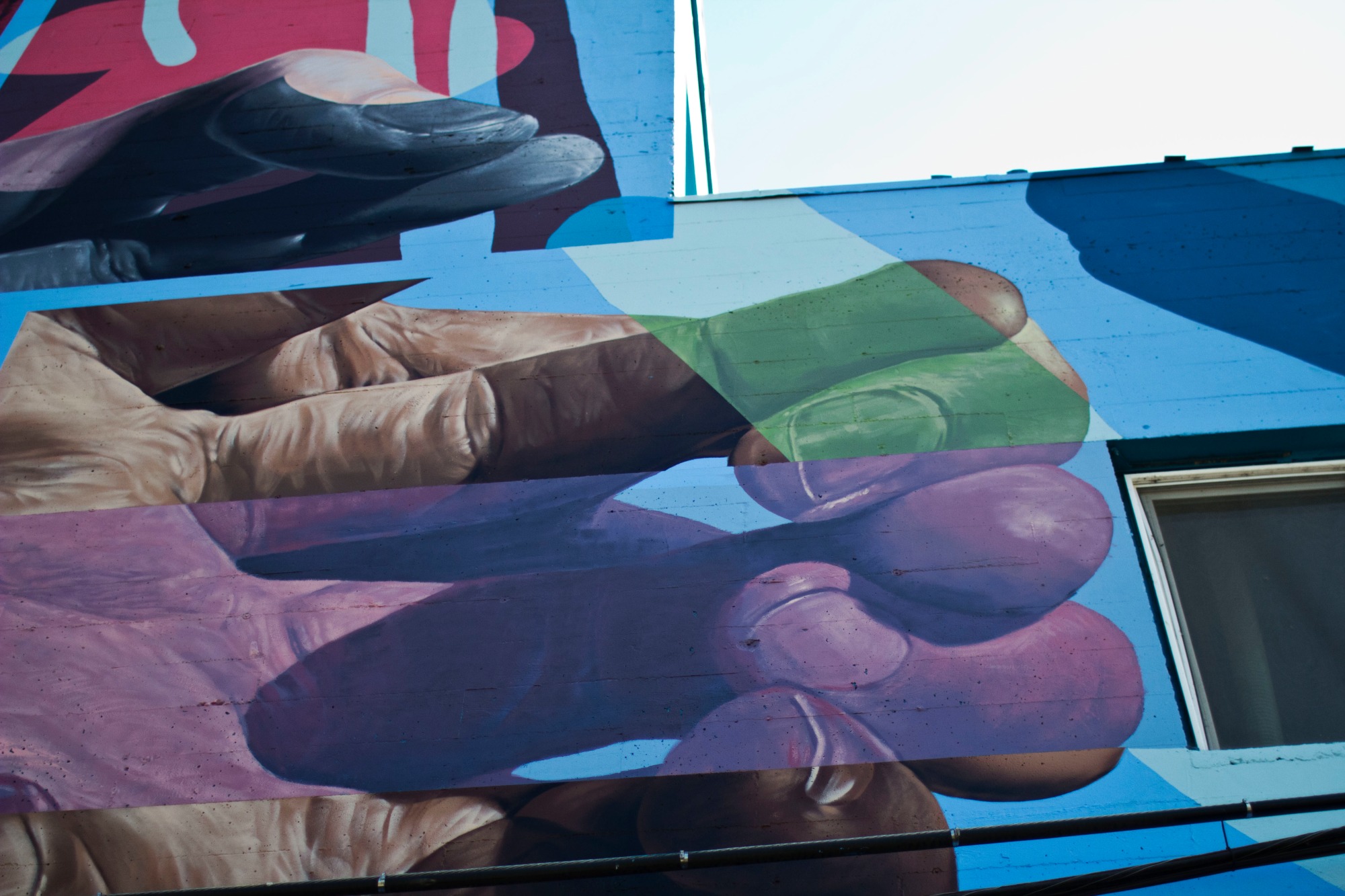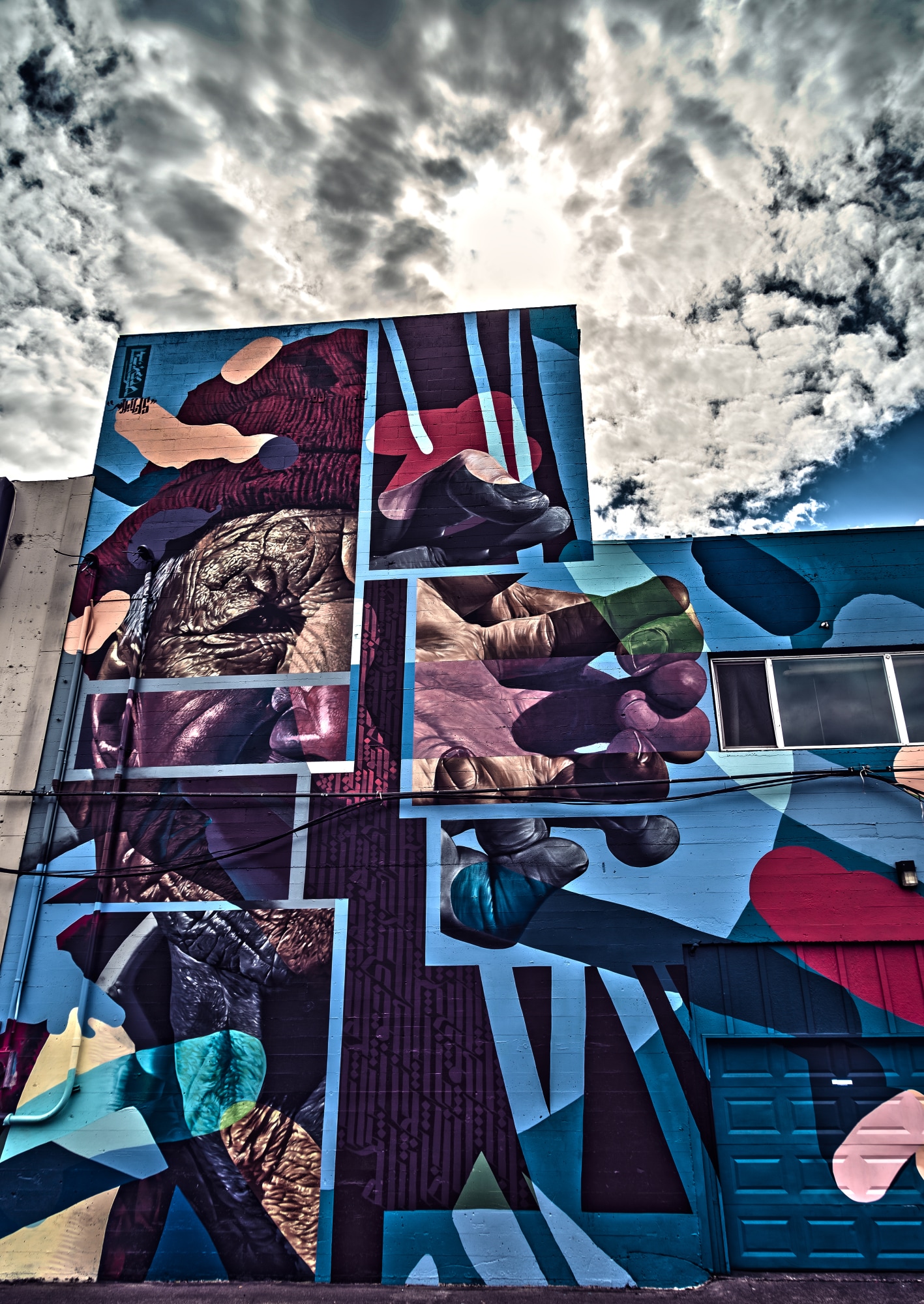 Delayed by visa trouble, H11235 missed 2018’s Eugene Walls but he arrived two weeks later and quickly put up his photorealistic half portrait of an old man from Nepal on the north wall at 755 Charnelton Street. He said the photorealism is countered by digital brush strokes, and the deconstructed nature of the mural speaks to order and chaos. His work can also be found at Lane Community College’s downtown campus, in an installation overlooking an outdoor courtyard.