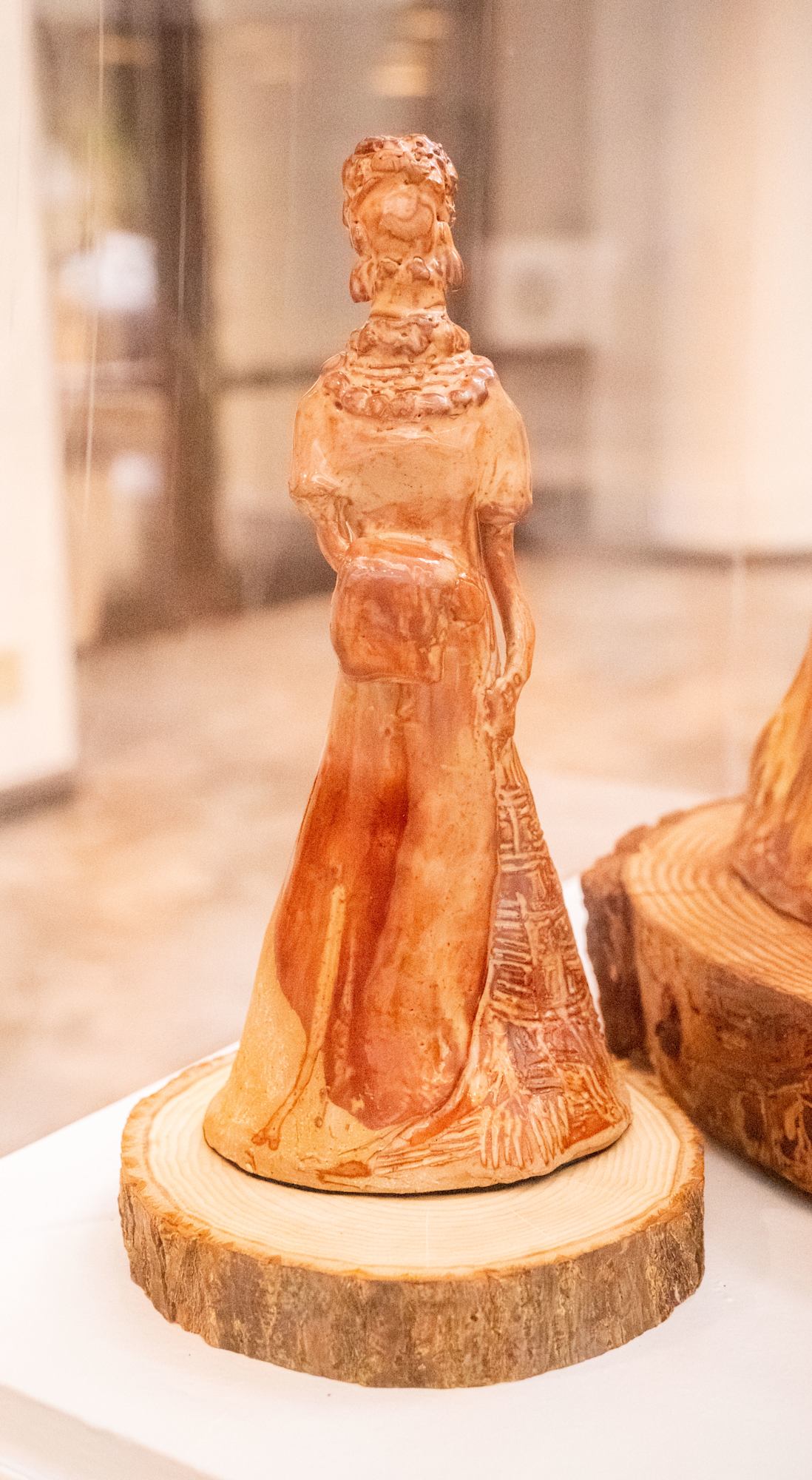 The sculpture is created with clay and the process of firing is Raku. Raku was used to give extra vibrancy to the glaze. The woman ancestors of the past had to work, raise children, and did this all with strength and resiliency.