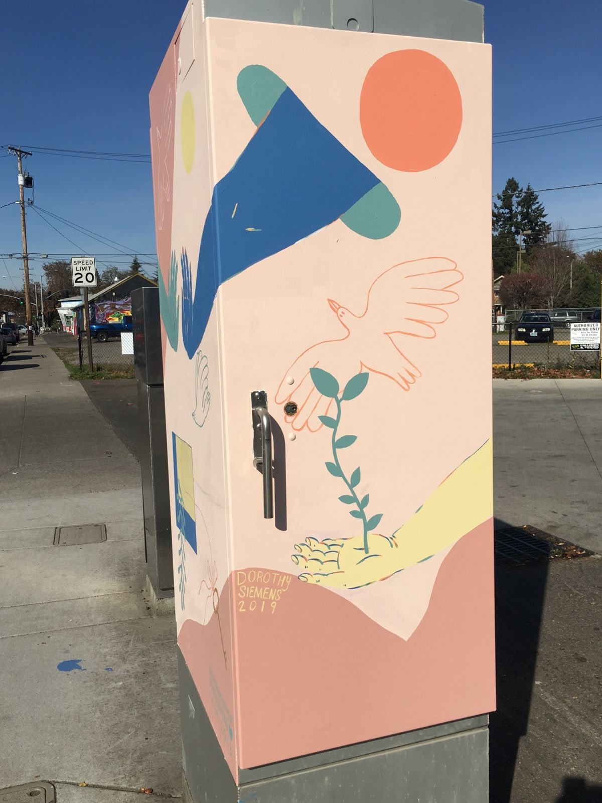 “This mural is an exploration of the grieving process, and dedicated to my father, Jimmy Siemens. He was deeply involved in the Whiteaker music scene before he passed away in 2012. It aims to recast grief as not solely a sad state of being - but instead a thing from which we grow and adapt, constantly tying our lives to those who we lost. From death spring life, and so the circle continues.”