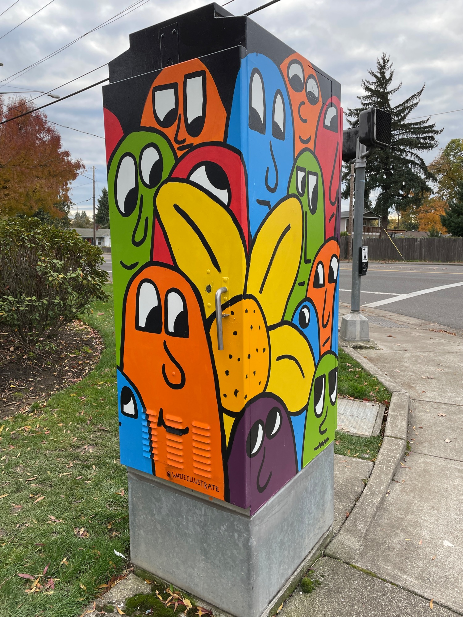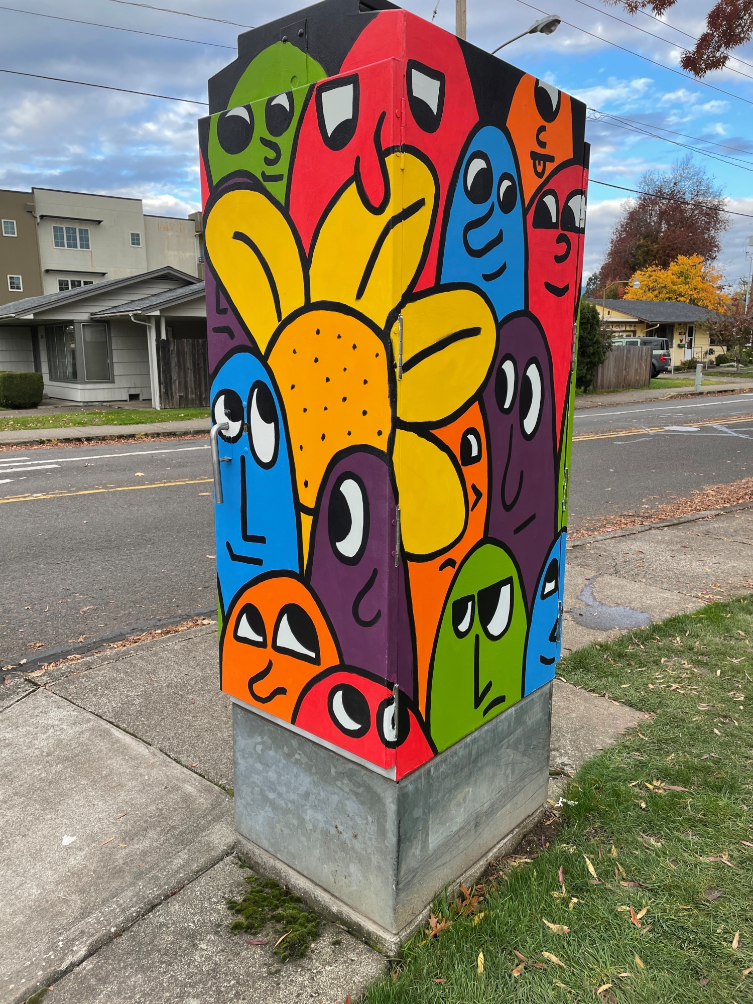 Brandon was commissioned to paint the traffic box at the intersection of Coburg Road and Bailey Lane. This intersection is a well-used intersection and has a pre-school, middle school, and memory care facility all within sight of the box. Brandon created a design based on what he calls his popsicle peeps. This allowed Brandon to infuse the design with characters that are able to showcase various emotions, making it fun to look at and interact with. The design utilizes bright primary colors and solid black lines which make the box very legible. The artwork was also designed to be a seamless wrap around all four sides that would be one continuous scene.