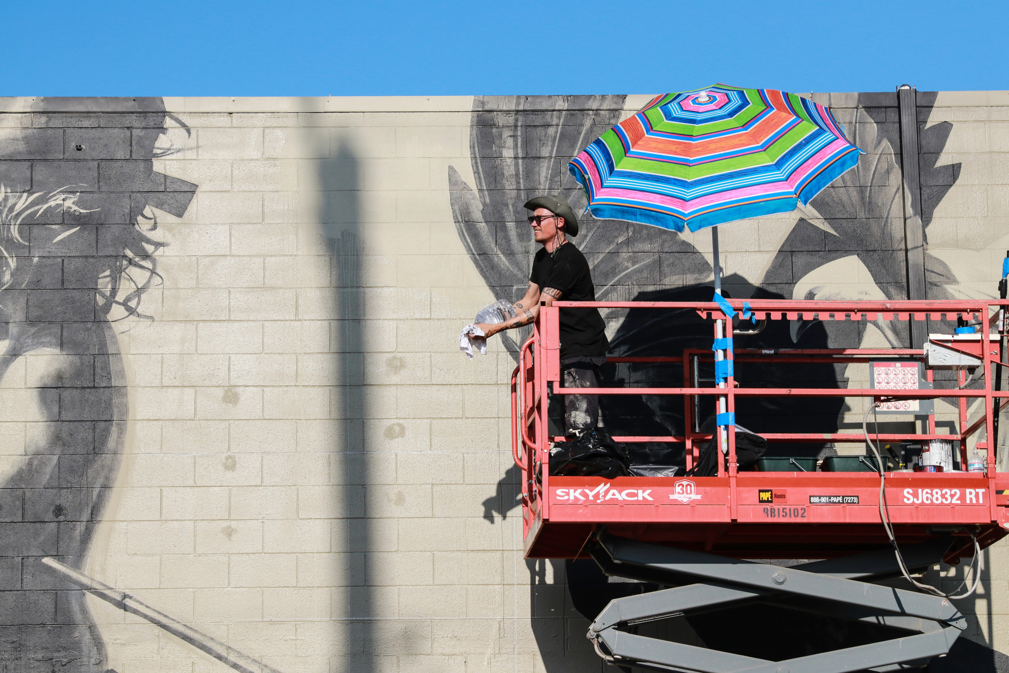 Named Meesie after his daughter, Waerts’ mural on the side of Well Balanced is supposed to be viewed right to left. The bird on the right side of the mural comes like a “broken down city, with bridges and poles on the water.” The left side with the child fishing is about new hope and prosperity in a world affected by climate change. Painted in two colors, this monochromatic mural is the artist’s third large-scale mural. His fourth is a 20×21 EUG Mural Project bonus mural on the back of the building at 856 Willamette St.