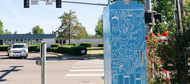 "I wanted to make art that reflects that we are all connected. By roads and satellites and everything in between. I wanted to convey this message quickly which led to the simple style. I wish I would have used more color but I am still proud of the art, to me it belongs to everybody that drives past."