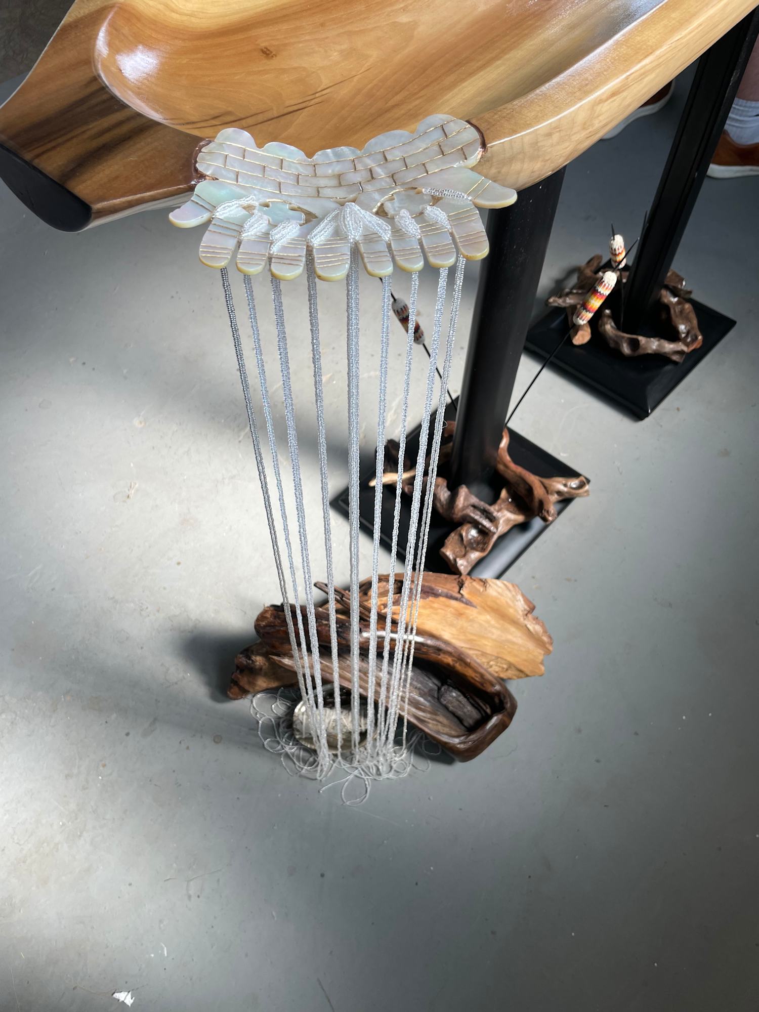 Hand-carved wood. Poplar wood, natural dyes, beads, shells, acrylic resin, tin foil, aluminum, water-based lacquer, paint.