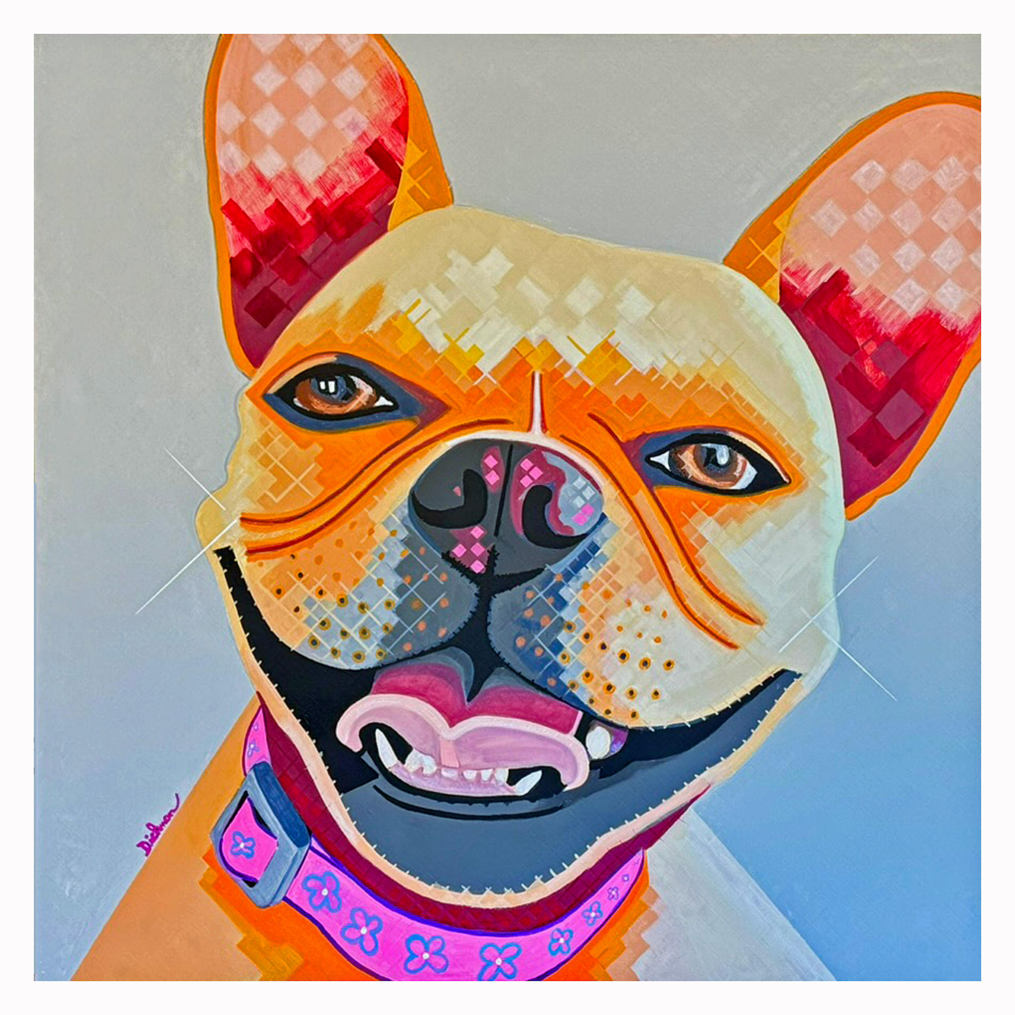 The artwork is a colorful, stylized painting of a French bulldog. The dog is depicted with a vibrant palette that includes shades of yellow, orange, and pink. Its ears are prominently outlined in orange and filled with a pattern of pink and red hues. The face features detailed expressions, with bright eyes and a slightly open mouth showing teeth and tongue. The dog wears a pink collar adorned with small floral designs. The overall composition uses geometric shapes and patterns, giving it a modern and playful aesthetic.