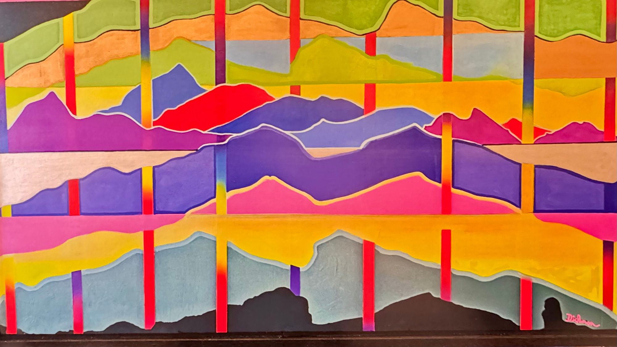 This painting features a series of multicolored layered, overlapping, and interdigitating silhouettes of Camelback Mountain .