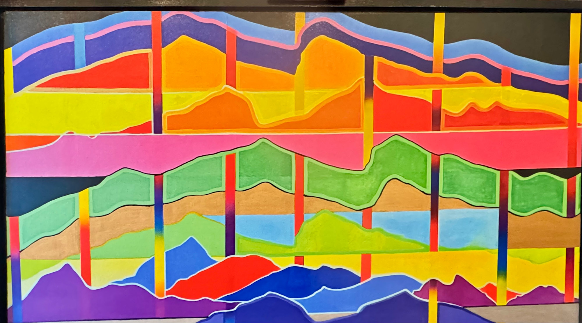 The artwork is a vibrant abstract composition featuring a series of undulating, wavy horizontal bands stacked vertically. Each band is divided into segments by vertical lines in bright colors. The horizontal bands are filled with distinct color blocks in bold, saturated hues, including silver, gold, blue, green, pink, purple, orange, and red, creating a dynamic contrast between the sections. The background is vivid and multilayered, which enhances the brightness of the layered shapes. The overall effect is a rhythmic and harmonious interplay of colors and forms, giving the piece an energetic and lively visual rhythm.